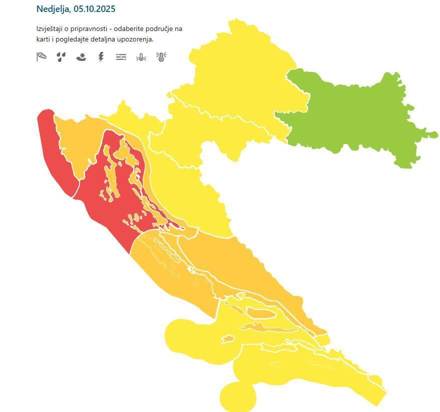 Za nedjelju je izdan i meteoalarm. Crveni stupanj upozorenja zbog jakog vjetra vrijedi za zapadnu obalu Istre, Kvarner i Kvarnerić te Velebitski kanal. Narančasti alarm izdan je za Kninsku i Riječku regiju, kao i za splitsko područje i sjevernu Dalmaciju.
