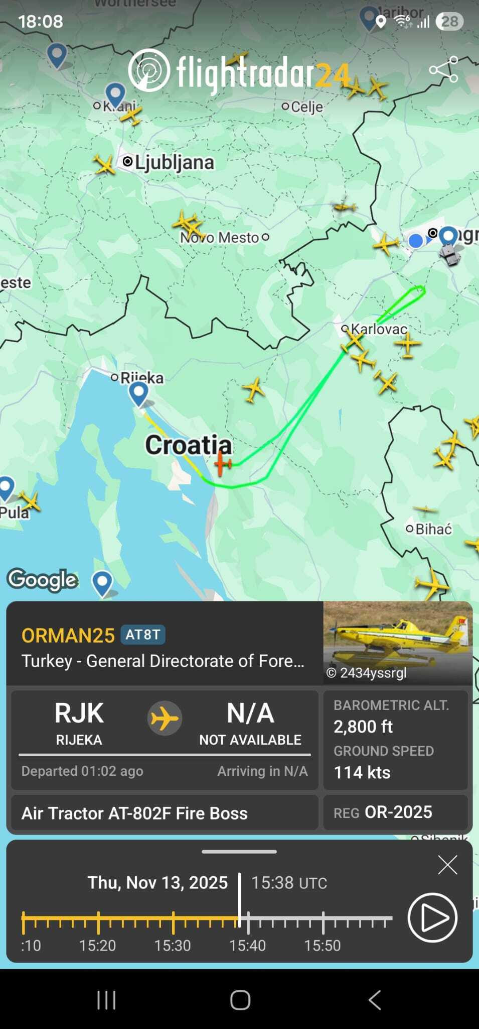 "Operativni centar civilne zaštite zaprimio je danas, 13. studenoga 2025., u 16:53 sati od Hrvatske kontrole zračne plovidbe informaciju o nestanku s radara turskog zrakoplova Air Tractor AT-802, koji je bio na kružnom letu Rijeka-Zagreb-Rijeka te je pokrenuta akcija potrage i spašavanja zrakoplova.