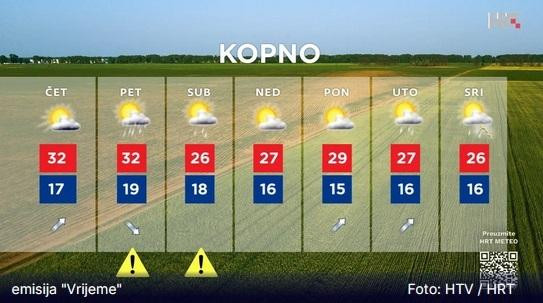 Malo viša dnevna temperatura bit će na istoku Hrvatske, gdje će naoblačenje s kišom i grmljavinom stići poslijepodne i navečer. Ponegdje pljuskovi mogu biti jače izraženi, praćeni tučom i obilnom oborinom. Poslijepodne će zapuhati umjeren i jak sjeverozapadni vjetar."