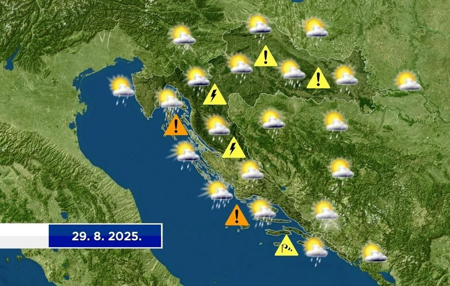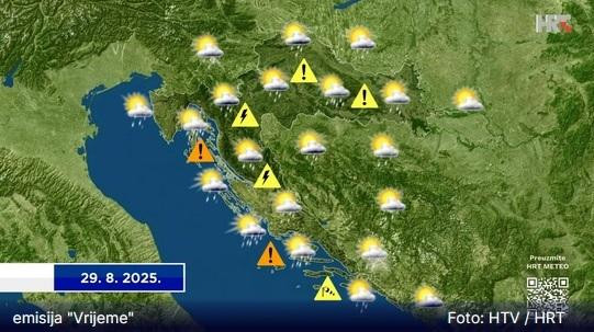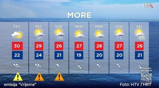 I na Jadranu u subotu promjenjivo s pljuskovima i grmljavinom, osobito u Dalmaciji. Ponegdje je moguće i olujno nevrijeme. U nedjelju i ponedjeljak djelomice sunčano, pa i sunčanije. U nedjelju malo kiše na jugu, a u ponedjeljak na sjeveru. U subotu i pnedjeljak puhat će umjereno i jako jugo, a u nedjelju prolazno sjeverozapadni vjetar.", prognozirao je za HRT Dragoslav Dragojlović iz DHMZ-a.