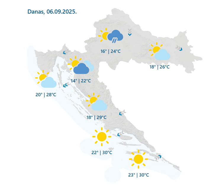 "Idućih dana na kopnu većinom sunčano, uz umjerenu naoblaku uglavnom tijekom nedjelje. Ujutro ponegdje magla, a u prometu budite oprezniji jer idući tjedan počinje i nova školska godina. Vjetar slab, jutra svježija, danju većinom vrlo toplo.