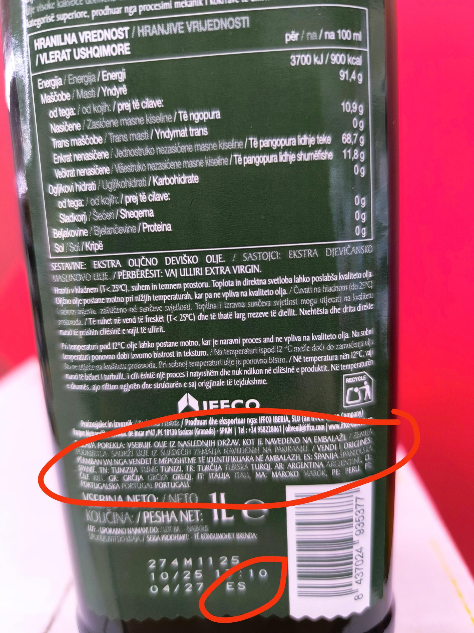 Ako vjerujemo navedenom, u jednolitarskoj boci koja se u trgovini prodaje za 4,89 eura nalazi se maslinovo ulje nastalo miješanjem ulja iz čak deset zemalja te četiri kontinenta, a zbunjuje još i oznaka na prednjoj strani proizvoda na kojoj, ispod imena, stoji kako je "pakirano u Španjolskoj".
