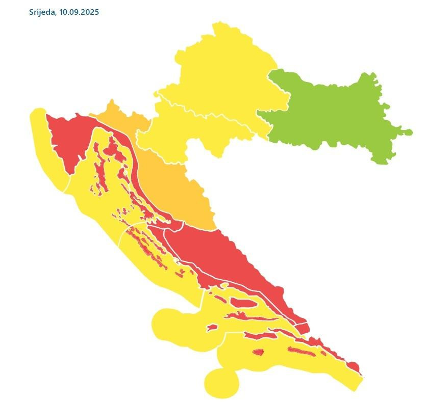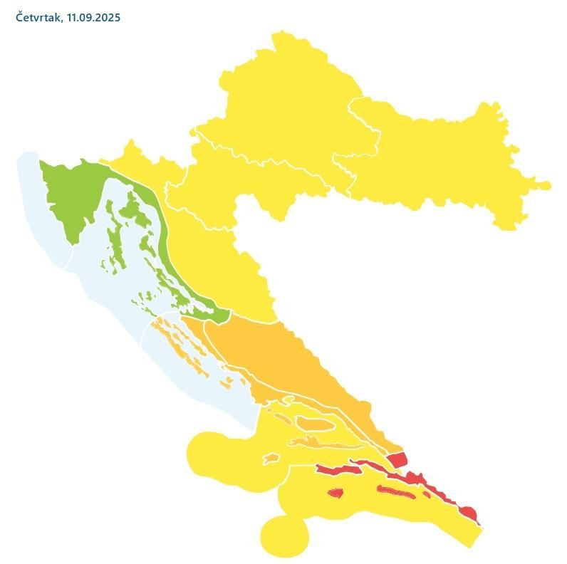 Za sutra je DHMZ crveno upozorenje izdao za područje Dubrovnika, dok je za splitsku i kninsku regiju za četvrtak na snazi narančasti meteoalarm.