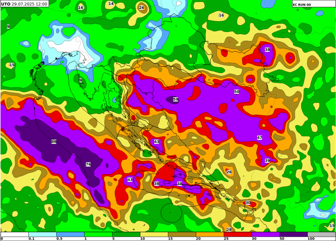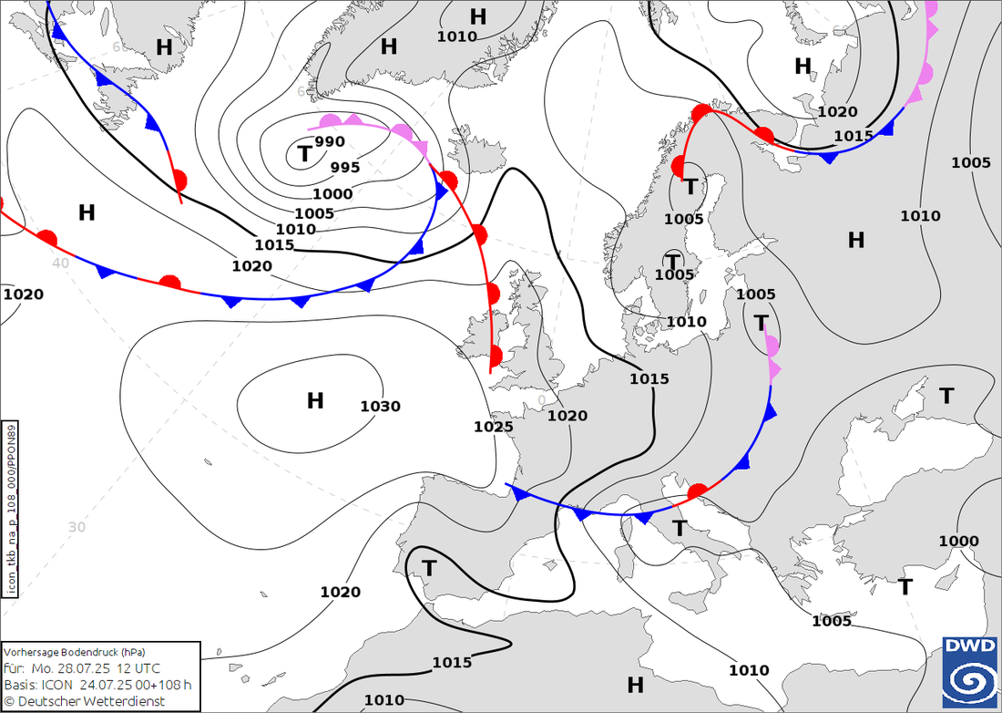 U drugom dijelu nedjelje vrijeme će se smirivati, no tek prolazno, jer će se već u ponedjeljak, 28. srpnja 2025. naglo produbljivati nova dolina nad Italijom te će se stvoriti visinska ciklona koja će se u noći na utorak, 29. srpnja 2025. premještati preko Hrvatske. Pri tlu će s prolaskom frontalnih poremećaja istovremeno pristizati nova količina vlažnog i nestabilnog zraka (Slika 3.).