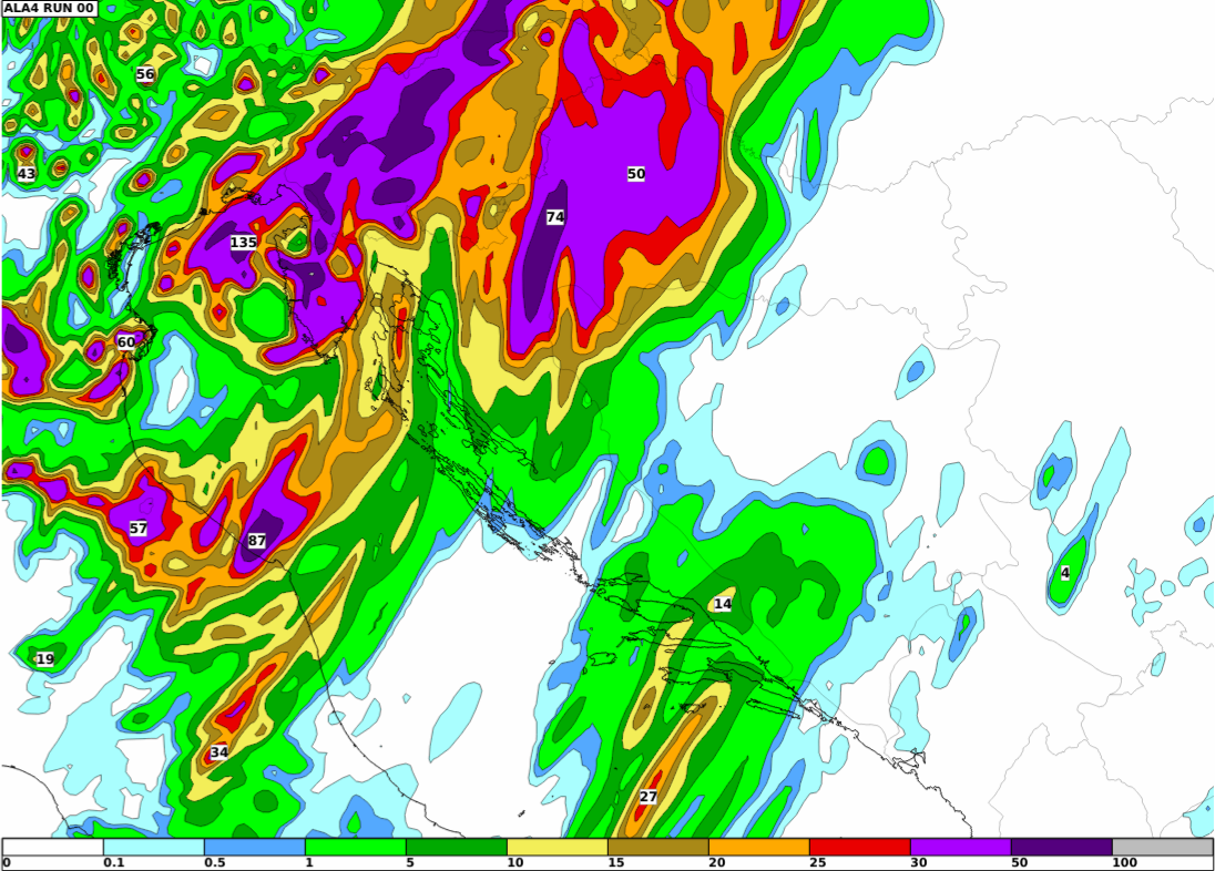 I u ovom drugom oborinskom valu lokalno će biti izraženih pljuskova s grmljavinom, ponajprije duž obale moguće i grmljavinskog nevremena. Ponovno je najizraženija oborina vjerojatnija u noći, i to s ponedjeljka na utorak. Ovoga puta obilna kiša moguća je i u drugim dijelovima zemlje (Slika 4.).