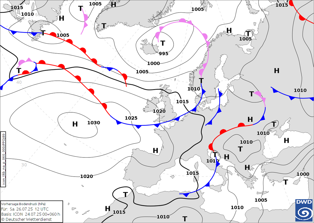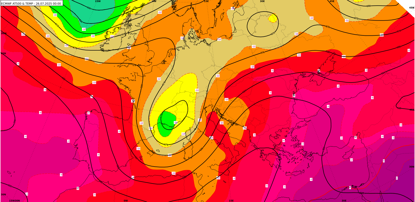 U subotu, 26. srpnja 2025. naše će krajeve zahvatiti izražena termobarička dolina unutar koje se nalazi visinska ciklona (Animacija 1.), pritom će nad naše krajeve tijekom dana postupno pristizati i sve nestabilniji i vlagom bogatiji zrak.