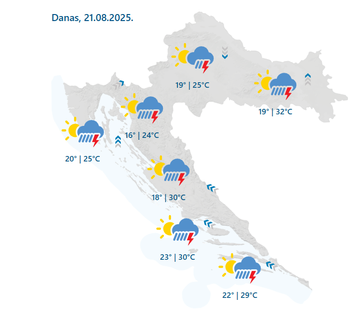 Za četvrtak je velika opasnost od nevremena proglašena za riječko područje i sjevernu Dalmaciju, gdje je na snazi crveno upozorenje, dok je ostatak Hrvatske pod žutim upozorenjem i narančastim (Slavonija i Dalmacija) zbog jakog vjetra i mogućih grmljavinskih nevremena, objavio je DHMZ.
