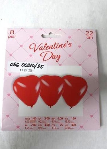 Valentines day baloni u obliku srca; Datum proizvodnje15/9/2024, barkod 2200359944163; Crveni lateks baloni u obliku srca u kartonskoj ambalaži; Proizvođač Pepco Poljska; Distributer Pepco Croatia