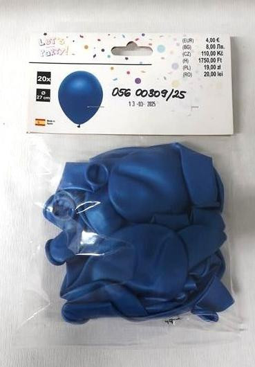 Baloni Lets party, set od 20 metalik plavih balona, promjera 27 cm, u plastičnoj ambalaži s papirnatom oznakom; tip/broj modela 459, barkod 82069001301000000400; Proizvođač Globos Festival Španjolska; Distributer TEDI
