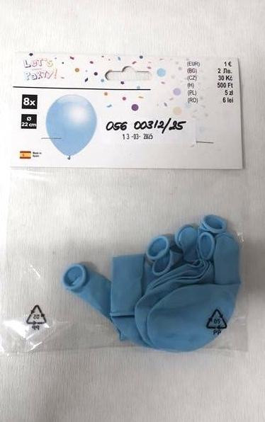 Baloni Lets party, set od osam plavih balona, promjera 22 cm, u plastičnoj ambalaži s papirnatom oznakom, tip/broj modela 177, barkod 66645001301000000100; Proizvođač Globos Festival Španjolska; Distributer TEDI