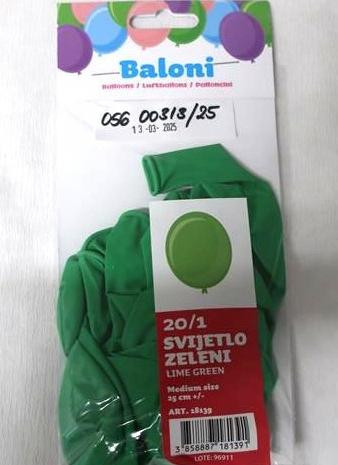 Baloni svijetlozeleni 20/1; Tip/broj modela: 96911, barkod 3858887181391, svijetlozeleni baloni u plastičnoj ambalaži s papirnatom oznakom: Proizvođač Comercial Persan Španjolska; Distributer Delfin Zaprešić