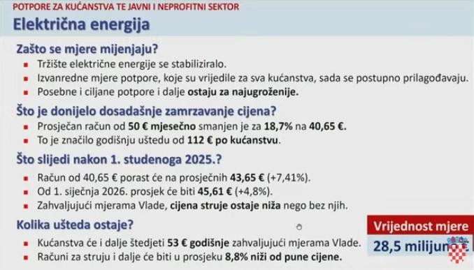 Od 1. listopada 2025. račun od 42 eura porast će za četiri eura ili 9,5 posto, na 46 eura mjesečno, što će i dalje biti četiri eura ispod cijene bez subvencija Vlade. Tako, istaknuto je, kućanstva će i dalje štedjeti oko 48 eura godišnje zahvaljujući mjerama Vlade, pri čemu je vrijednost ove Vladine mjere 18 milijuna eura.