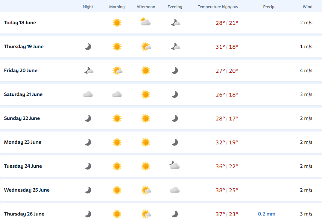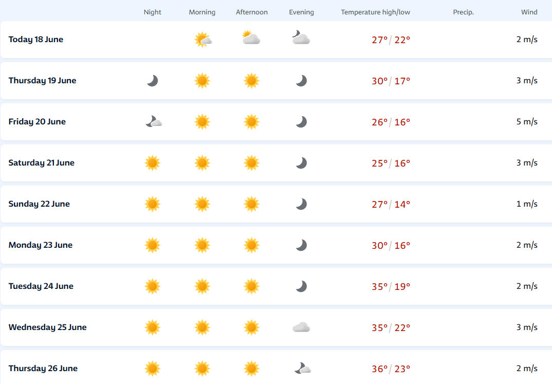 U narednih tjedan dana u Zagrebu se očekuje sunčano vrijeme, uz povremeno umjerenu naoblaku, ali oborina ne bi trebalo biti. Temperature će postupno rasti, ali do sredine sljedećeg tjedna ne bi trebalo biti prevruće. Za vikend Zagrepčane očekuje dnevna temperatura između 26 i 28 stupnjeva, a od ponedjeljka bi temperatutre trebale početi prelaziti 30 stupnjeva Celzijevih.