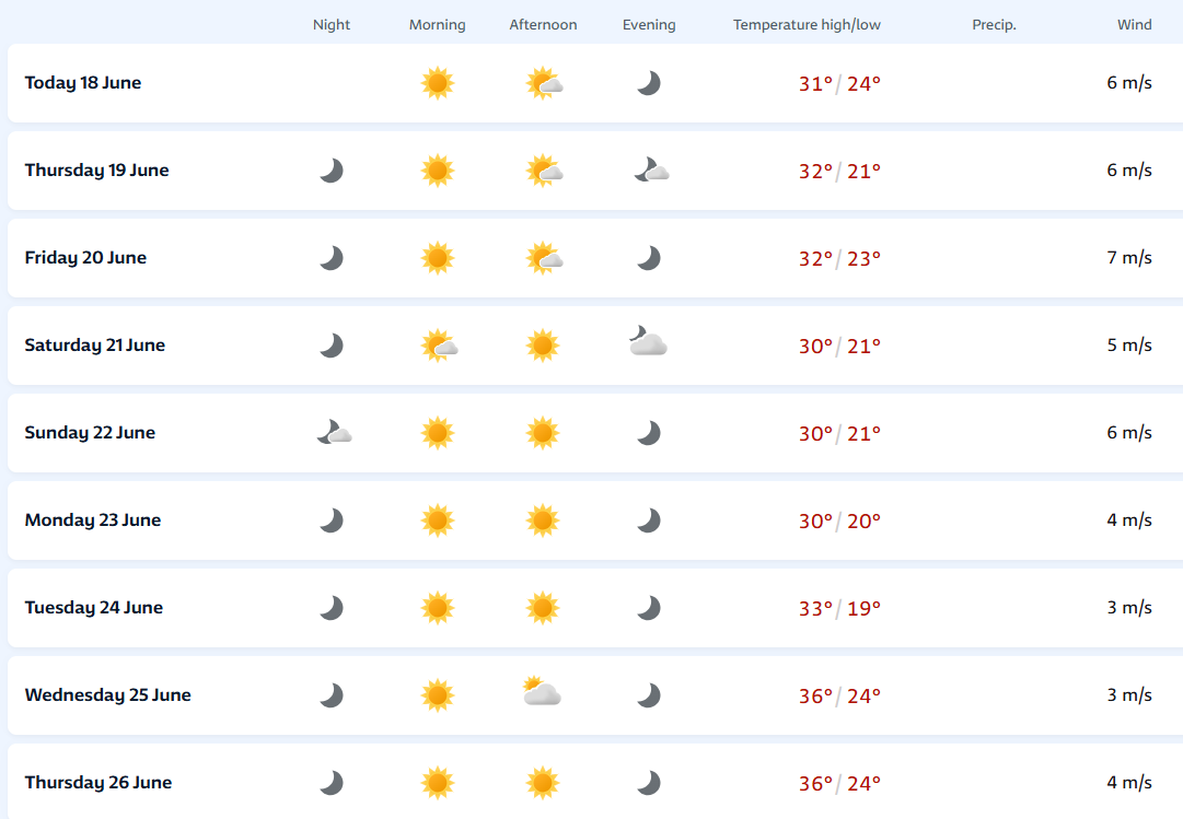 Do kraja tjedna najlakše bi trebalo biti na istoku Hrvatske. Osječani će za vikend uživati u ugodnim temperaturama koje će se kretati između 25 i 27 stupnjeva, a prvi znaci toplinskog vala stižu početkom tjedna kada bi temperatura trebala rasti do 30 stupnjeva. Prave vrućine stižu već u utorak kada će temperatura biti 35 stupnjeva, a slično će se vrijeme nastaviti i u srijedu i četvrtak kada će živa rasti do 36.