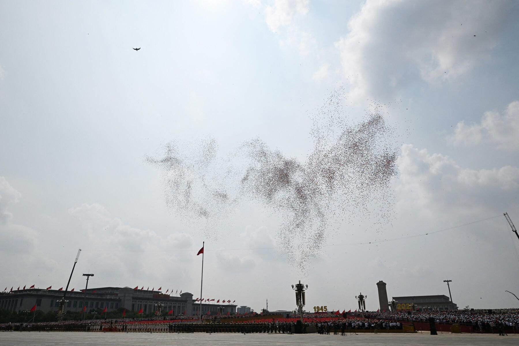 Parada je završila puštanjem 80 tisuća bijelih golubova i balona iznad trga, simboličnim prizorom koji je trebao predstavljati mir.