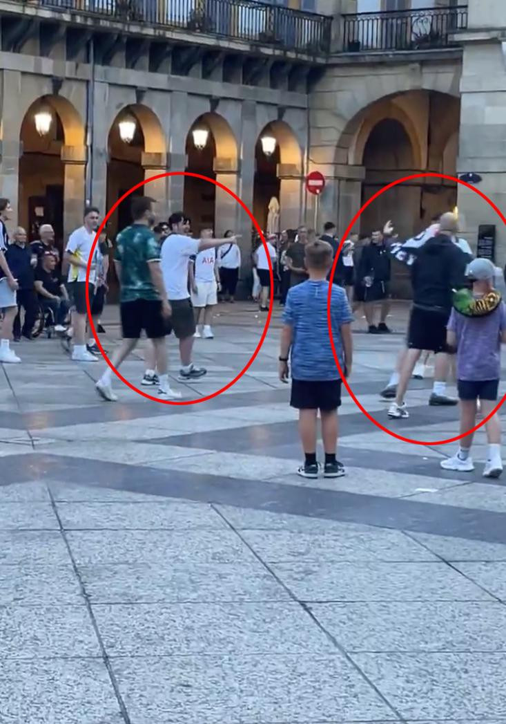 Novine El Correo napisale su da su navijači Tottenhama uništili dva semafora te ih potom poput trofeja podigli u zrak. Tottenhamovi se navijači uglavnom skupljaju u Ulici radosti diplomanata, a Unitedovi na neoklasicističkom Novom trgu. Španjolski mediji pišu da je nekoliko navijača Uniteda drugog navijača udarilo šakom u glavu. Osam je policajaca interveniralo nakon toga incidenta koji se dogodio upravo na Novom trgu.
