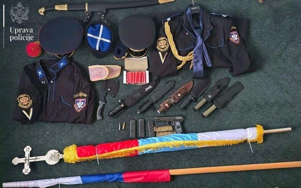 Među oduzetim predmetima pronađene su i brojne vojne uniforme, panciri, kacige, SIM kartice, komunikacijski uređaji, kao i iskaznice Crnogorskog kozačkog bratstva, često s različitim imenima.