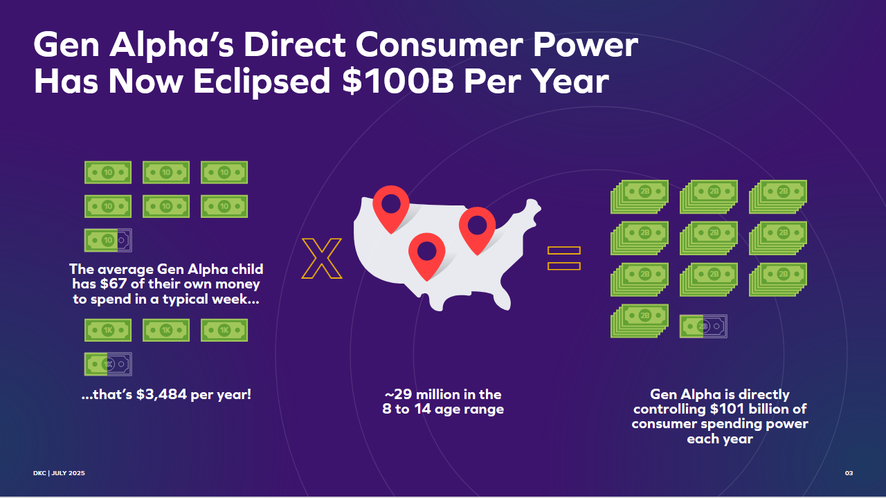 Prema podacima iz DKC-ova izvješća, prosječni pripadnik alfa generacije, dakle djece rođene u razdoblju od 2010. do 2024. godine, na tjednoj bazi raspolaže sa 67 dolara vlastitog novca, što čini iznos od 3484 dolara godišnje.