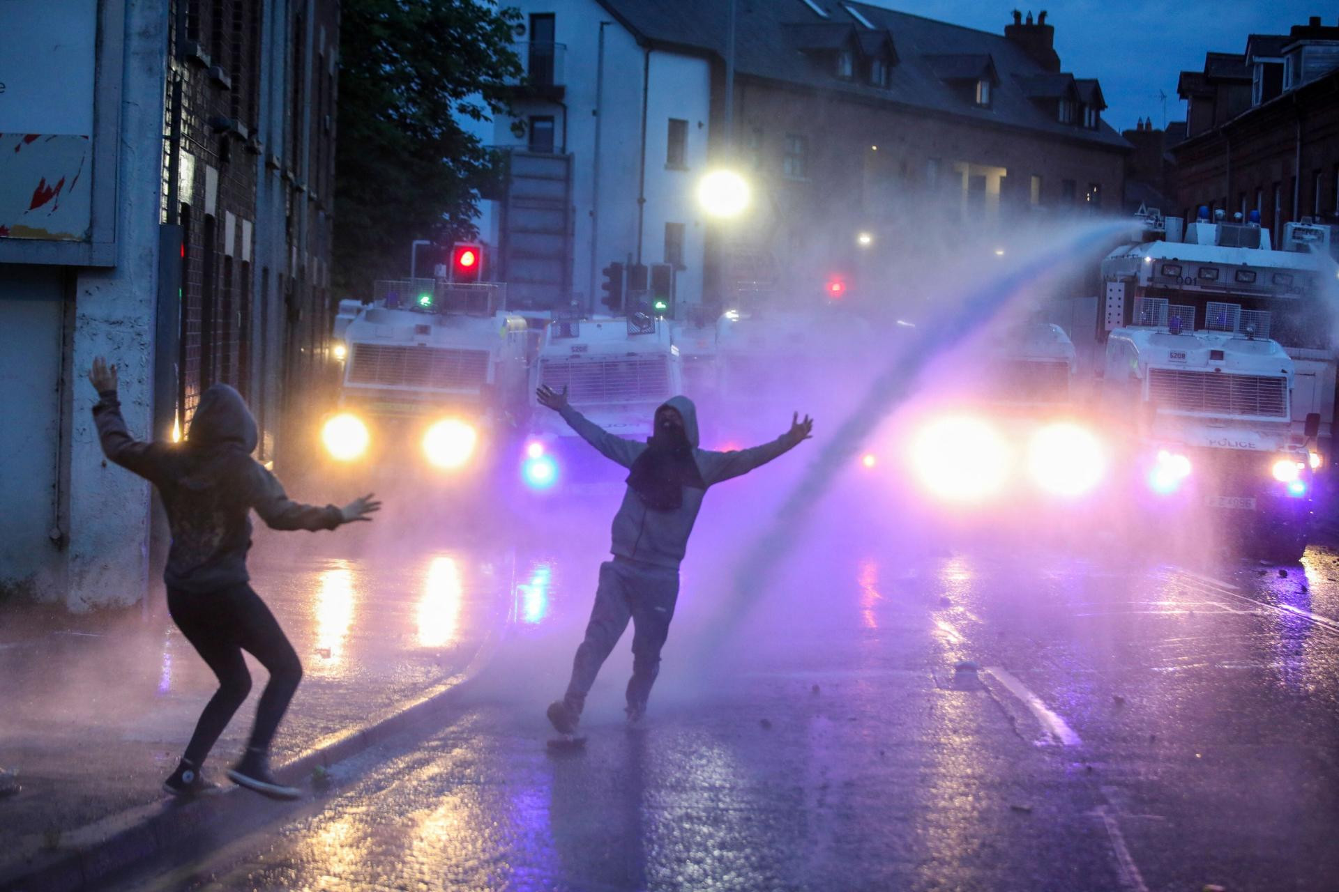 Interventna policija i oklopna vozila blokirali su ceste u Ballymeni u srijedu navečer pred stotinama okupljenih. Dvadesetak maskiranih mladih ljudi bacalo je kamenje, pirotehnička sredstva i molotovljeve koktele na policiju, rekao je očevidac Reutersu.