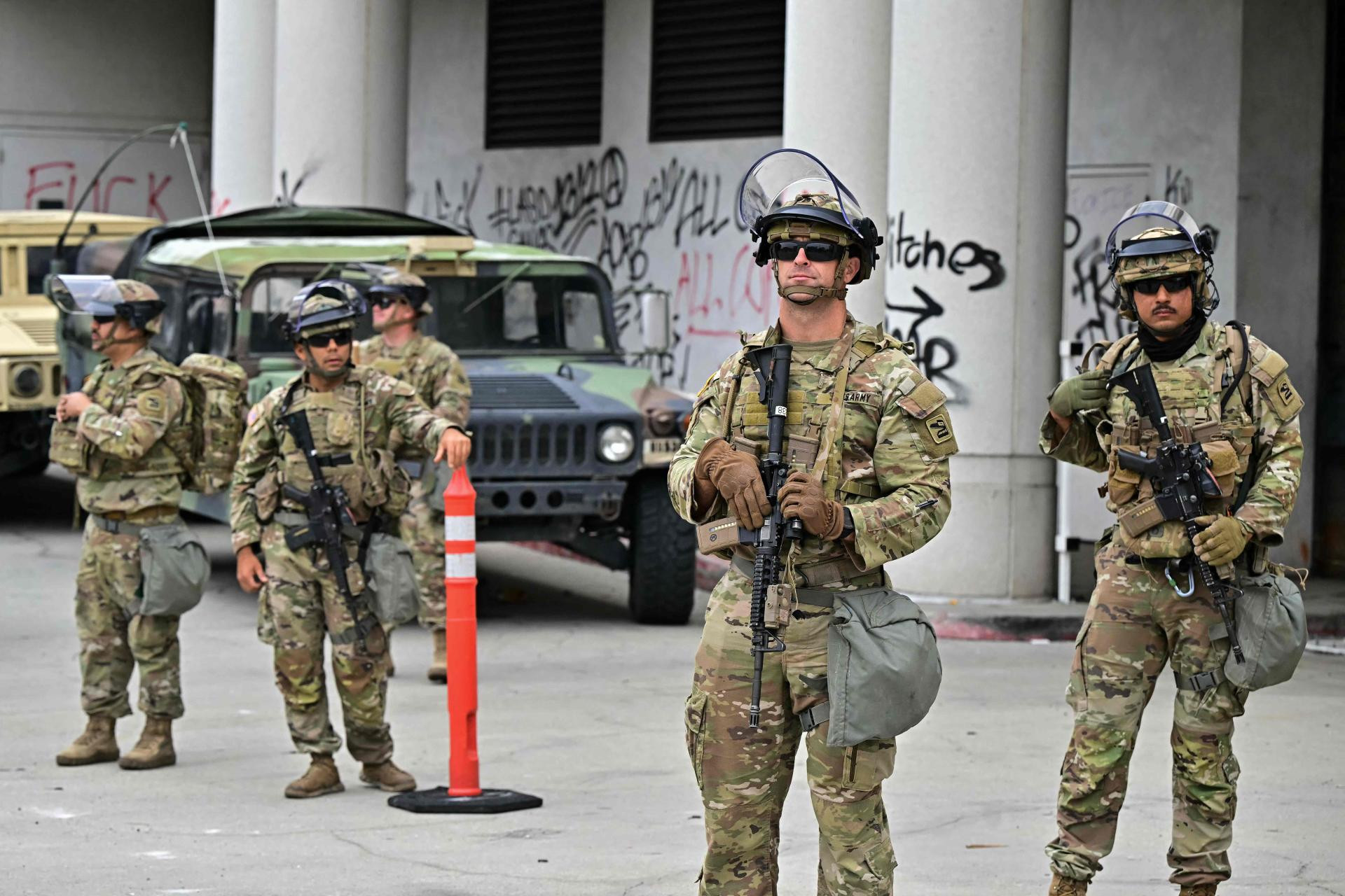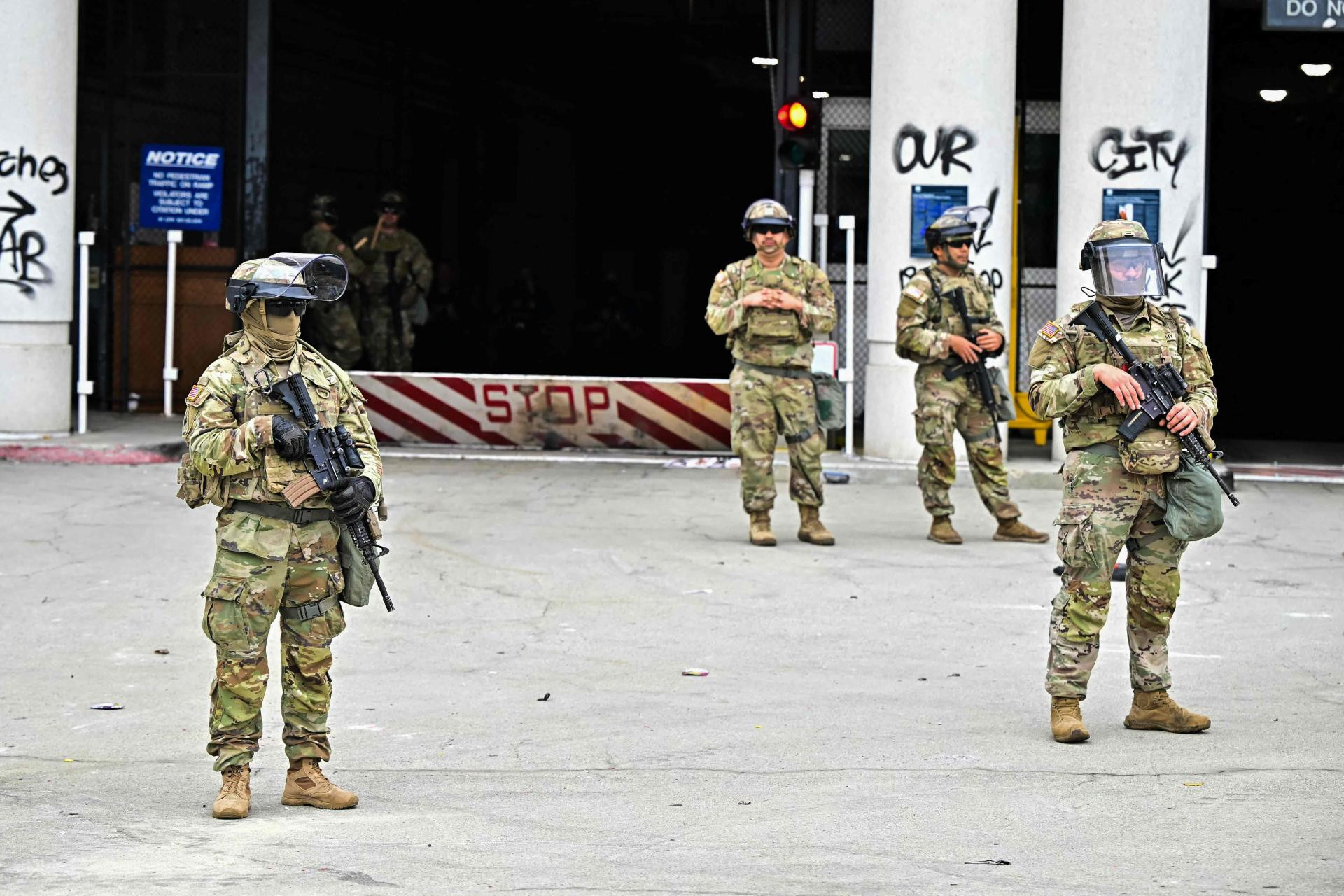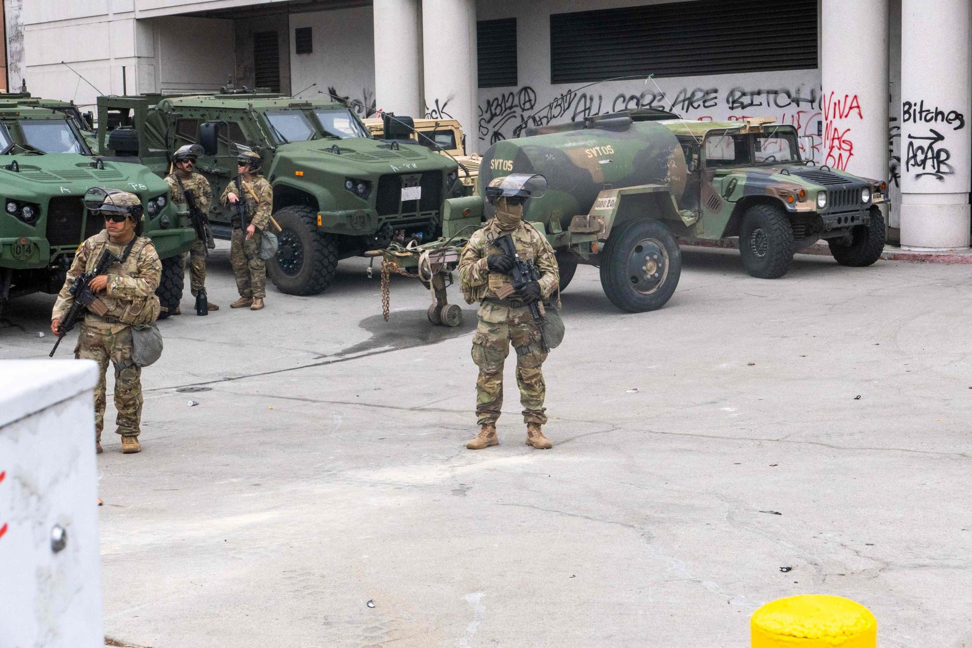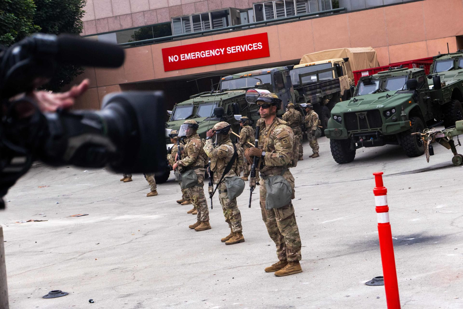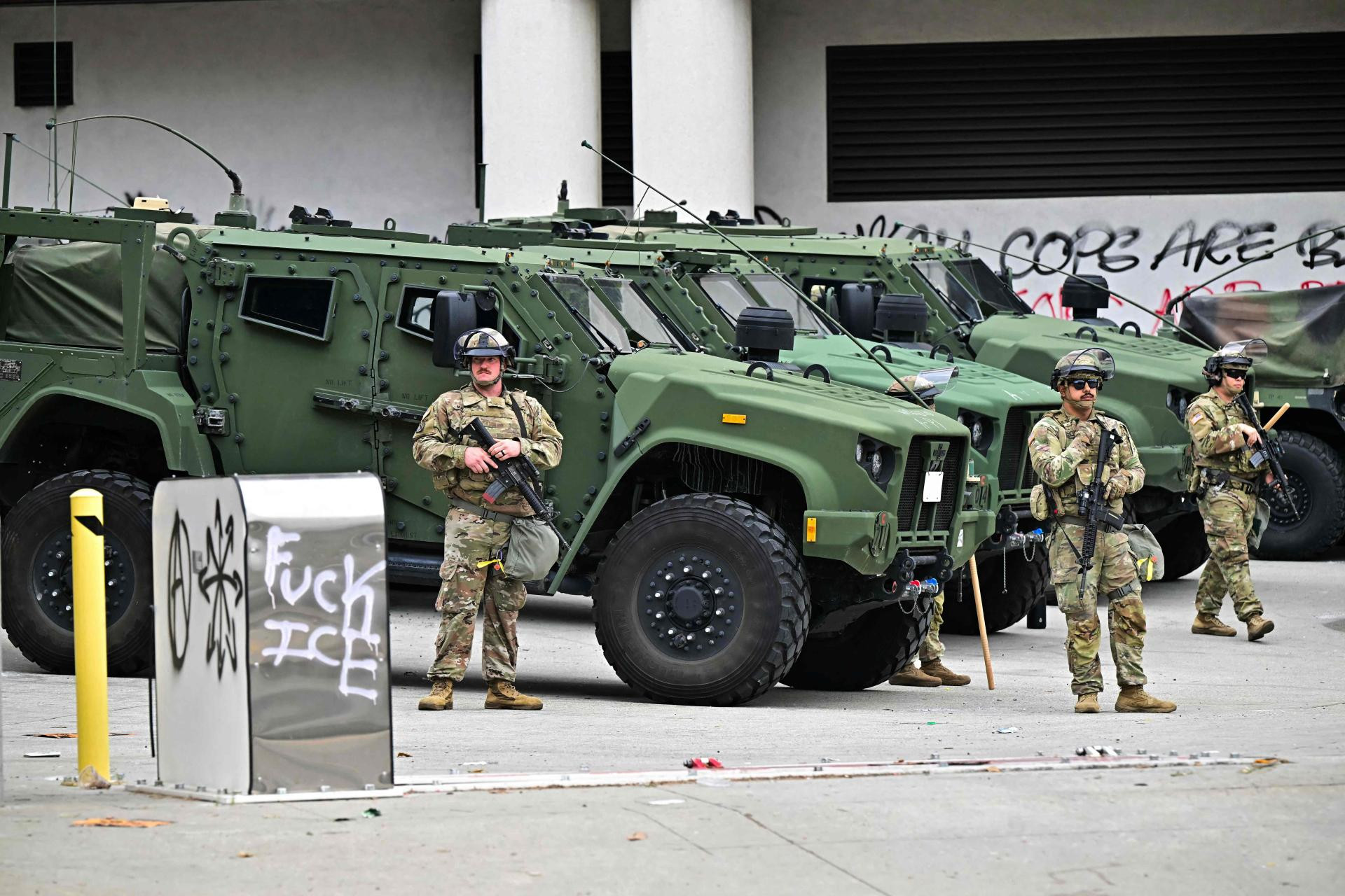Na videosnimkama od nedjelje ujutro desetak pripadnika Nacionalne garde postrojava se ispred zgrade saveznih vlasti u središtu Los Angelesa, kamo su odvedeni pritvorenici iz imigracijskih racija provedenih u petak, zbog čega se prosvjedovalo i u subotu.