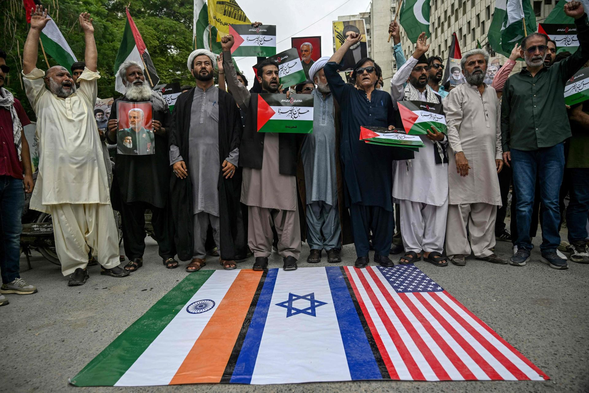 Velika američka zastava sa slikom Trumpa postavljena je na cestu tako da su prosvjednici preko nje mogli hodati i gaziti je. Demonstranti su izvikivali uvredljive slogane protiv Amerike, Izraela i pakistanskog regionalnog neprijatelja Indije.