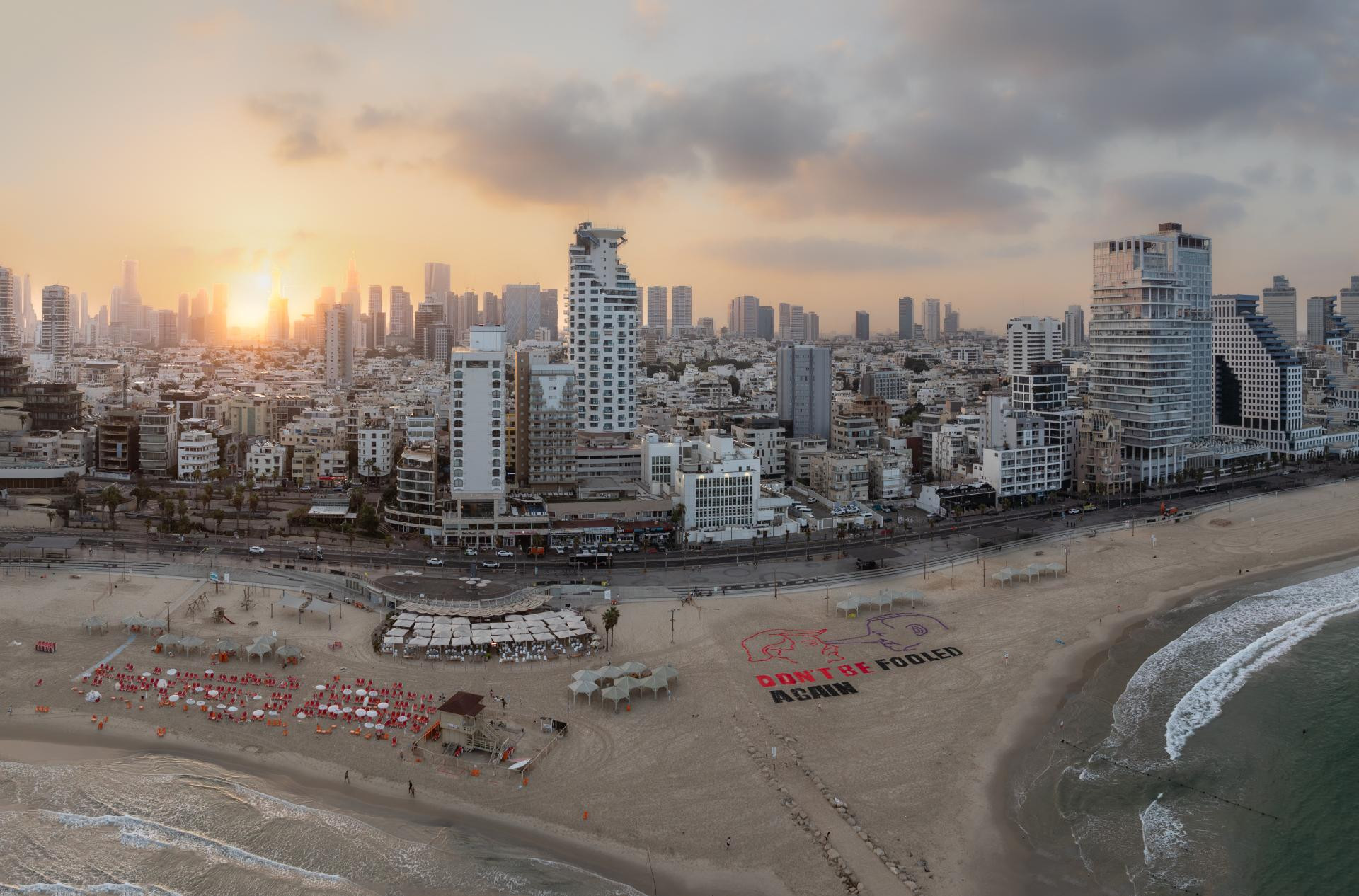 Velika umjetnička instalacija na plaži u Tel Avivu prikazuje američkog predsjednika Donalda Trumpa i izraelskog premijera Benjamina Netanyahua, koji nalikuje Pinokiju, liku iz dječje priče kojem nos raste nakon što izgovori laži.