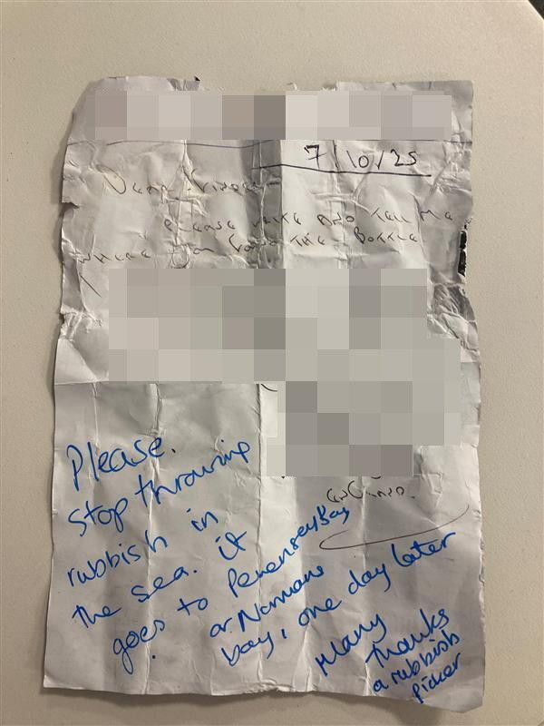 U poruci je pisalo: "Molim vas, prestanite bacati smeće u more. Stigne u Pevensey Bay ili Normans Bay dan kasnije. Hvala, jedan sakupljač smeća."