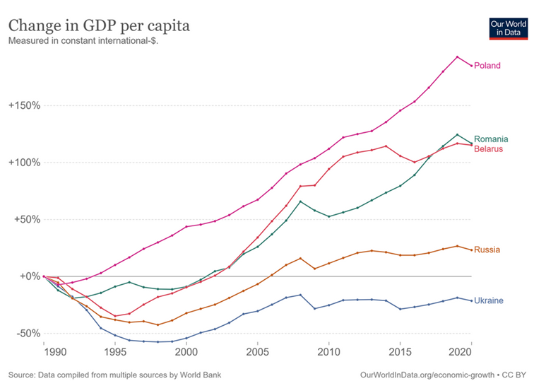 Mnoge će iznenaditi, ali Ukrajina je danas s BDP-om per capita od oko 13.000 dolara (što je na razini Libije) oko 20 posto siromašnija nego što je bila 1990. godine odnosno neposredno prije raspada Sovjetskog saveza. Niz zemalja koji se oslobodio ekonomskog koncepta koji je nametao SSSR od devedesetih do danas bilježile su vrlo visoke stope rasta, ne i Ukrajina.