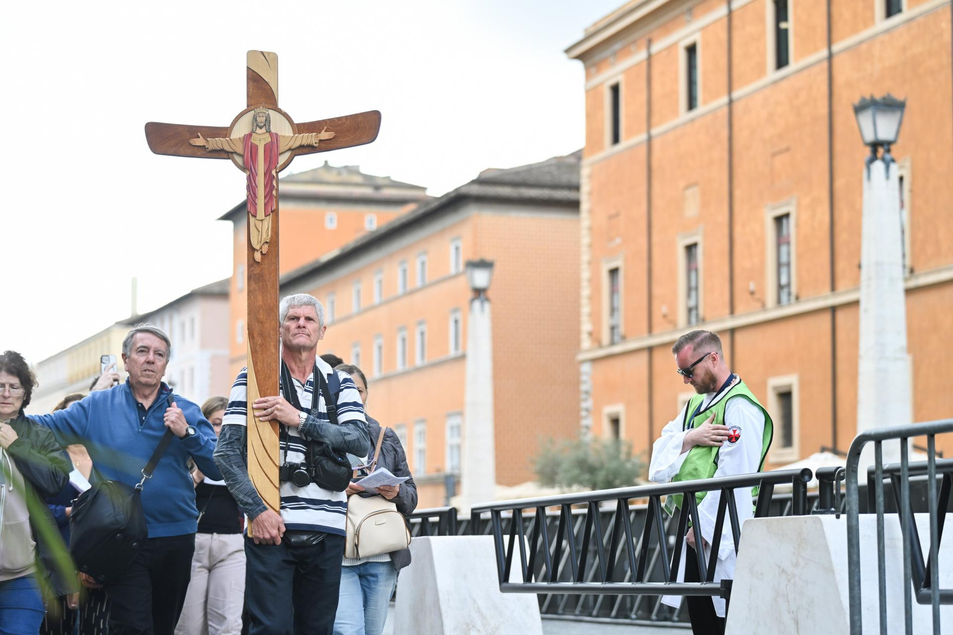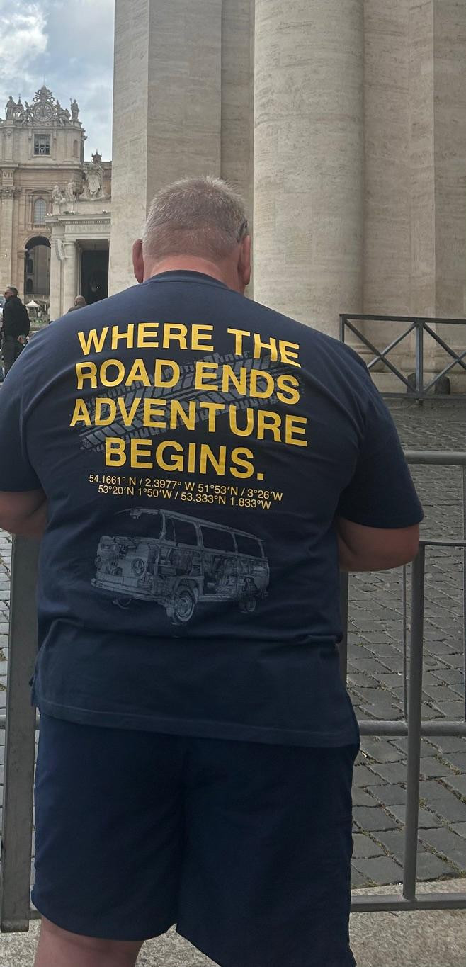 Uz sam Trg svetog Petra, stoji muškarac na čijoj majici stoji napisano ‘Tamo gdje cesta završava, avantura počinje‘