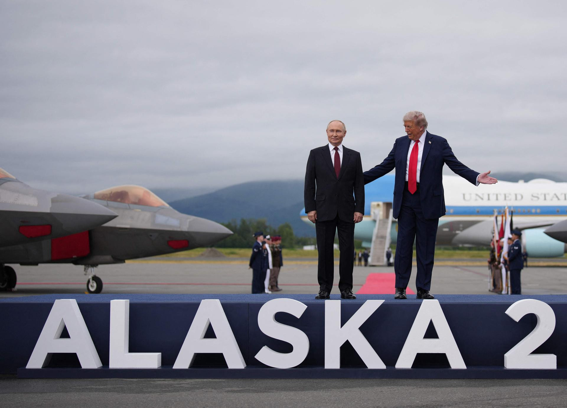 Put dvojice lidera prema postavljenoj bini pratio je prelet američkih bombardera B-2. Trump im je zapljeskao, a Putin podigao pogled prema nebu, kako bi ih bolje vidio. Bila je to suptilna demonstracija američke vojne moći. Novinari su dobacivali pitanja ruskome predsjedniku: “Kad ćete prestati ubijati civile?”, “Hoćete li pristati na prekid vatre?”, no on se pravio da ih ne čuje, stavljajući ruku na uho i odmahujući.