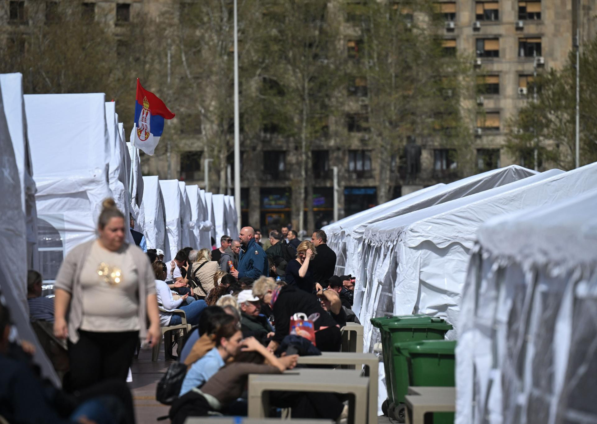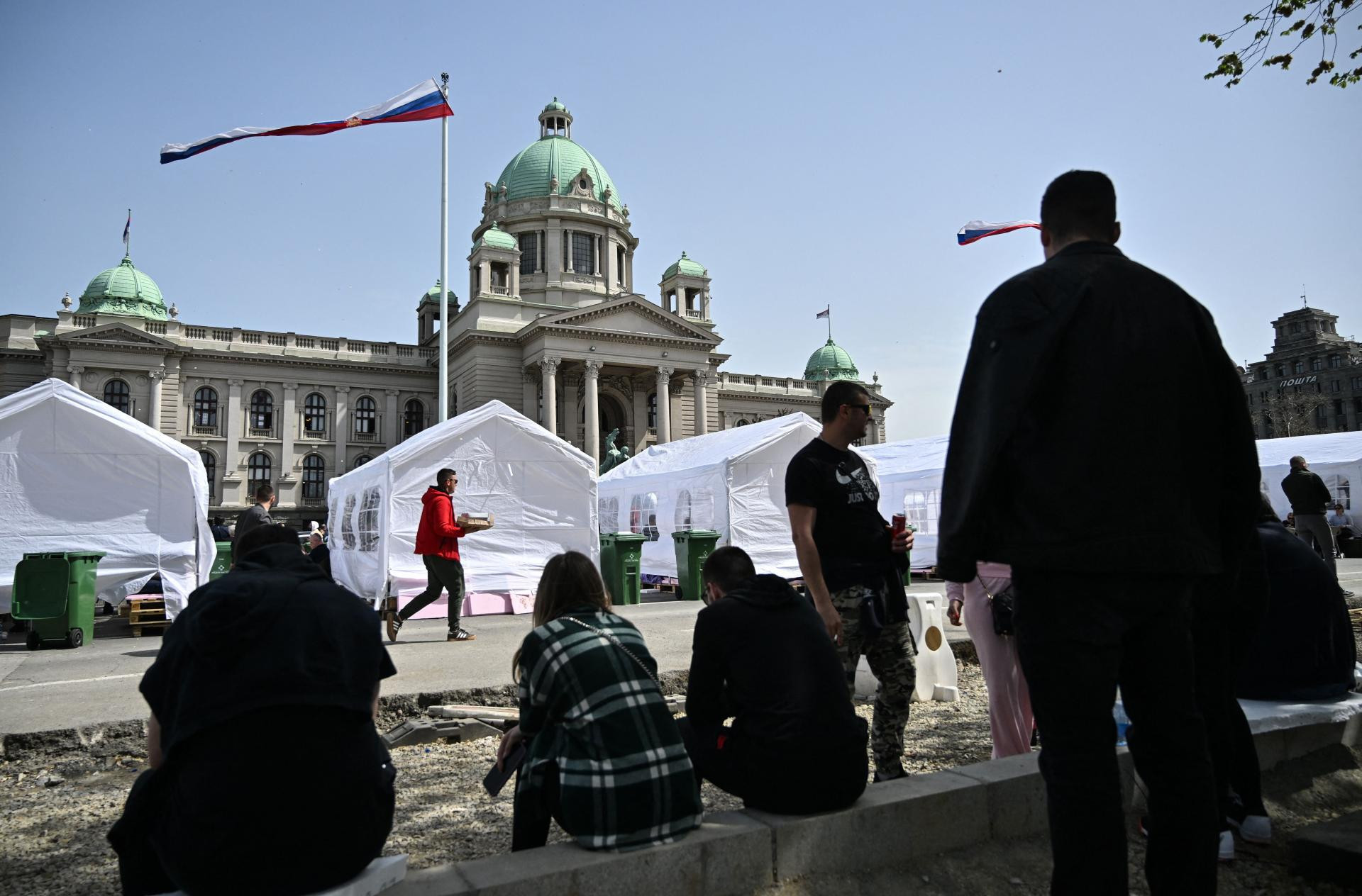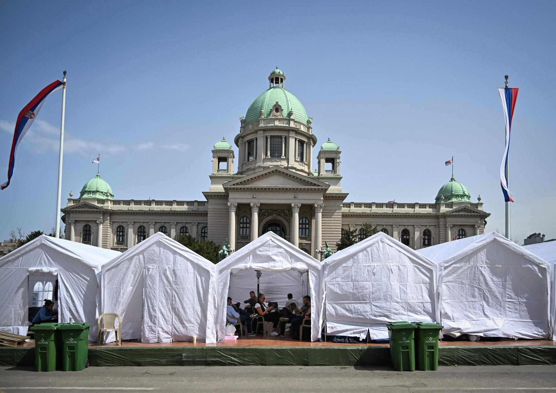 Ispred takozvanog ‘Ćacilanda‘ ispred Skupštine Srbije, pokraj novopostavljenih bijelih šatora se pojavio i vojni autobus, a skupina navijača je razvila transparent s natpisom ‘Familija srpskih navijača‘.