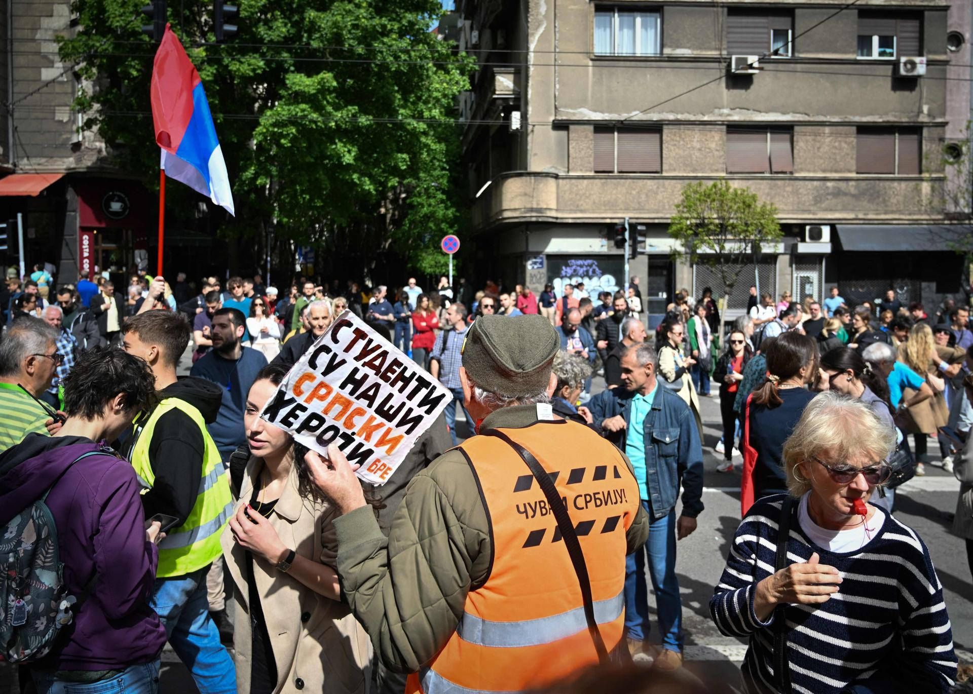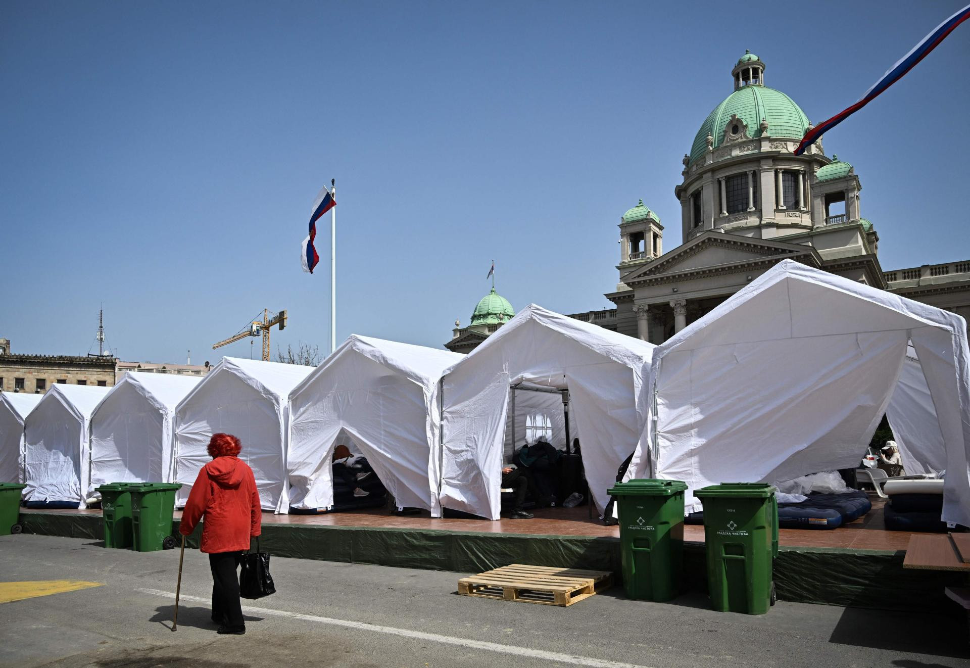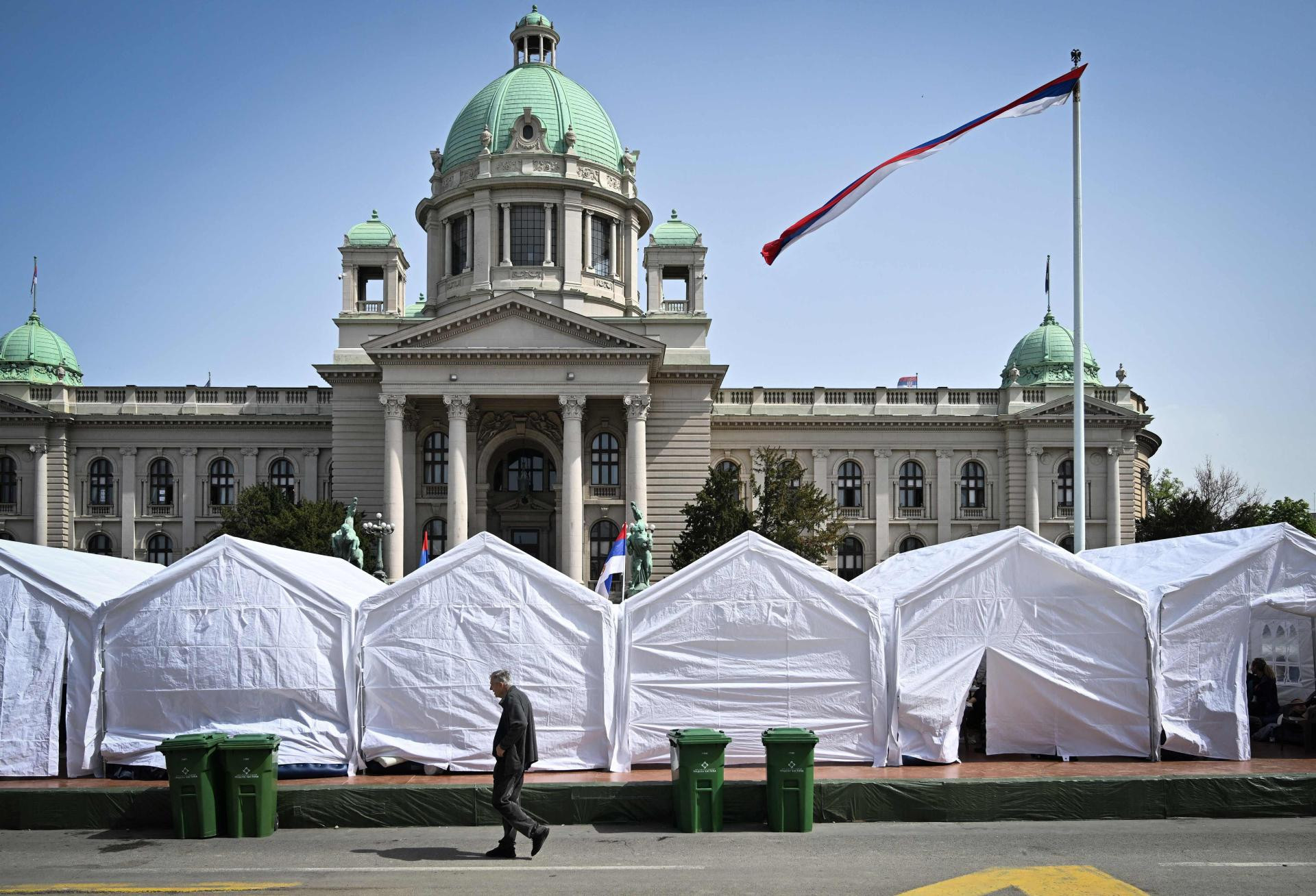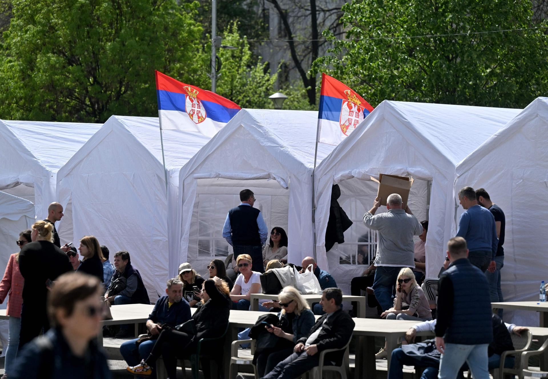 Ispred takozvanog ‘Ćacilanda‘ ispred Skupštine Srbije, pokraj novopostavljenih bijelih šatora se pojavio i vojni autobus, a skupina navijača je razvila transparent s natpisom ‘Familija srpskih navijača‘.