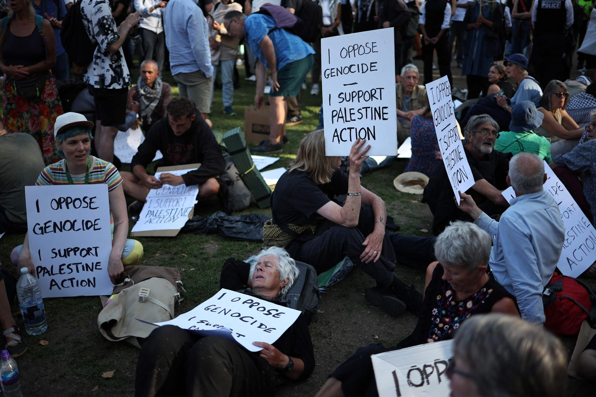 Neki iz gomile, koja je sjedila na travi unutar Trga Parlamenta, viđeni su kako u 13 sati na transparentima ispisuju: "Protivim se genocidu, podržavam Akciju za Palestinu"..