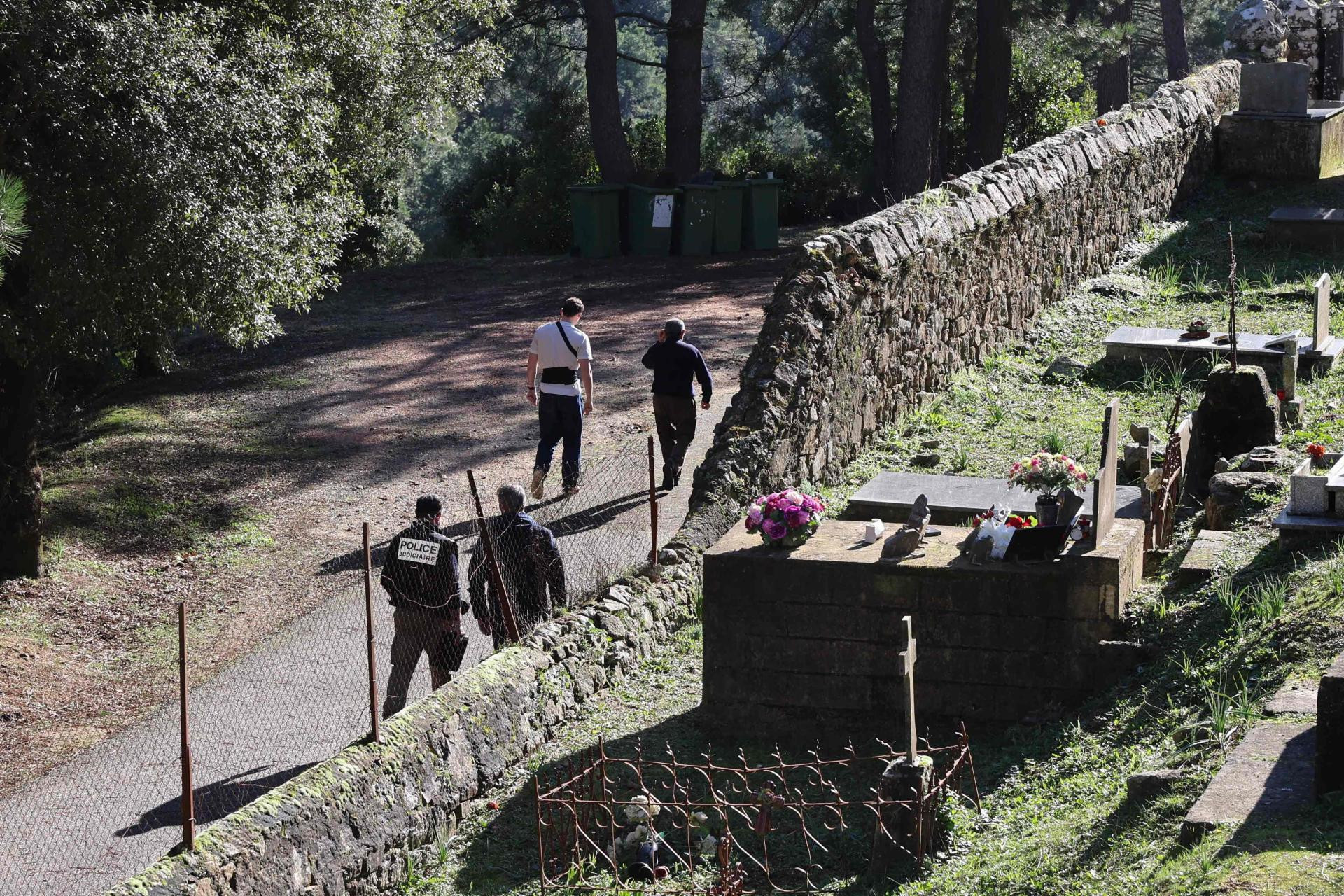 Pripadnici policije na groblju u Veru u potrazi za dokazima 13. siječnja 2026. godine, dan nakon što je na istome mjestu tijekom majčina pogreba ubijen Alain Orsoni