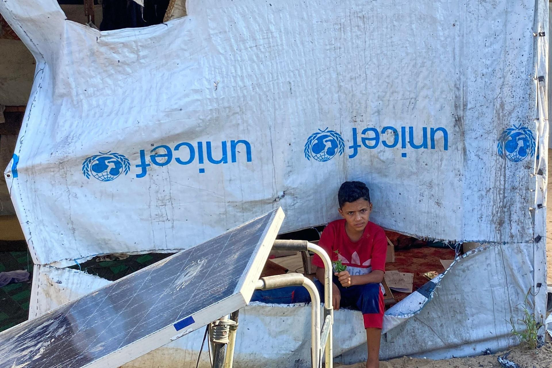 Palestinski dječak sjedi pored šatora za raseljene Palestince u području Mawasi u Kan Junisu