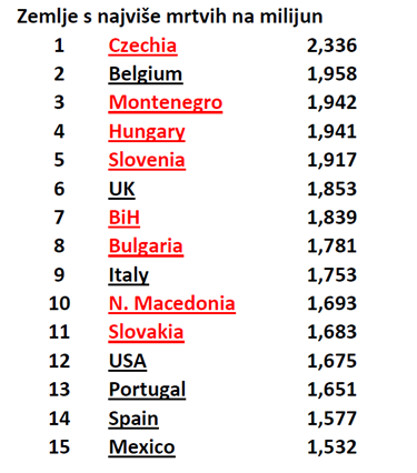 Ispod je tablica 15 najgorih zemalja na svijetu po broju smrti na milijun u kojoj su crveno označene zemlje središnje i centralne Europe.