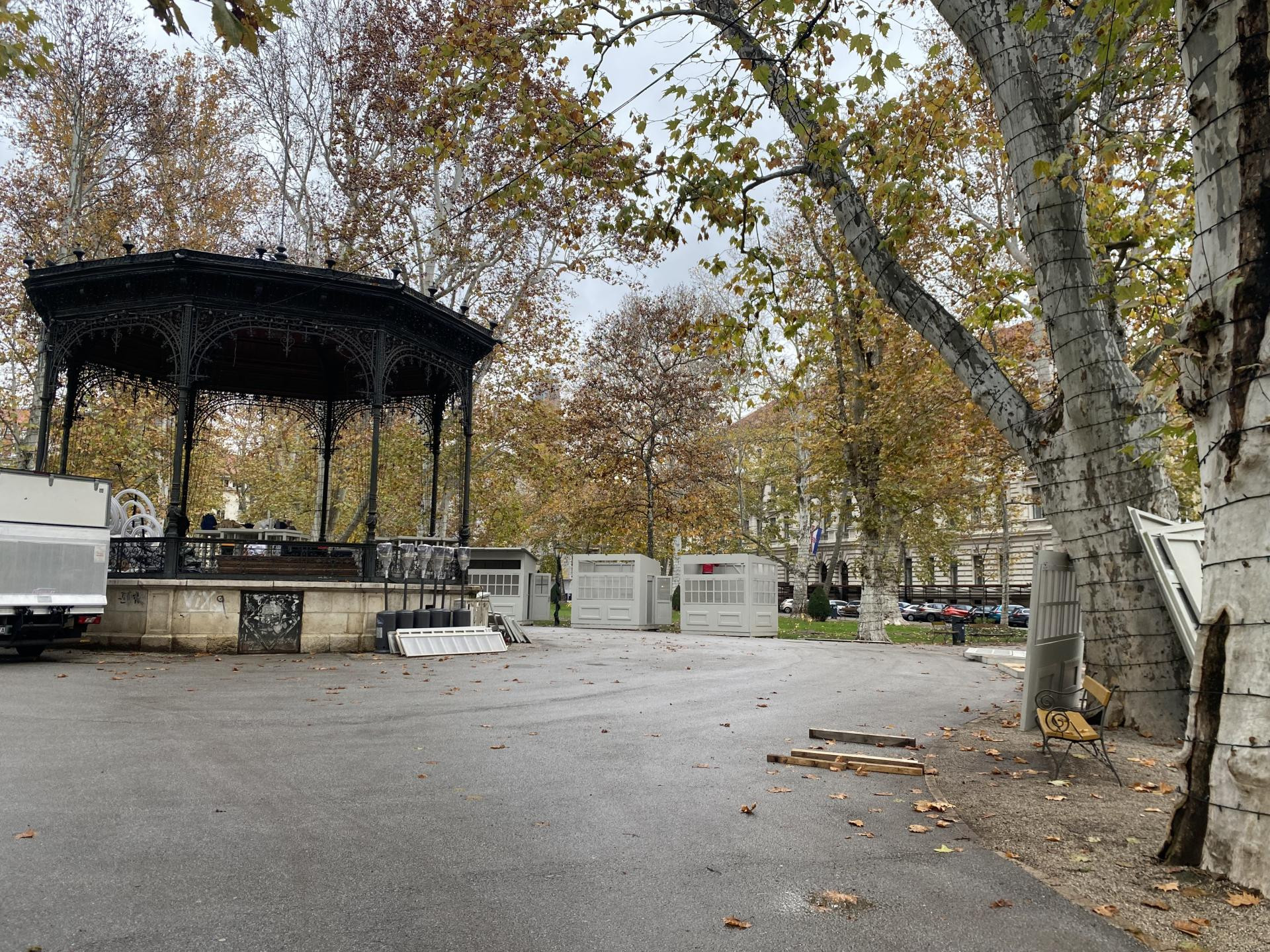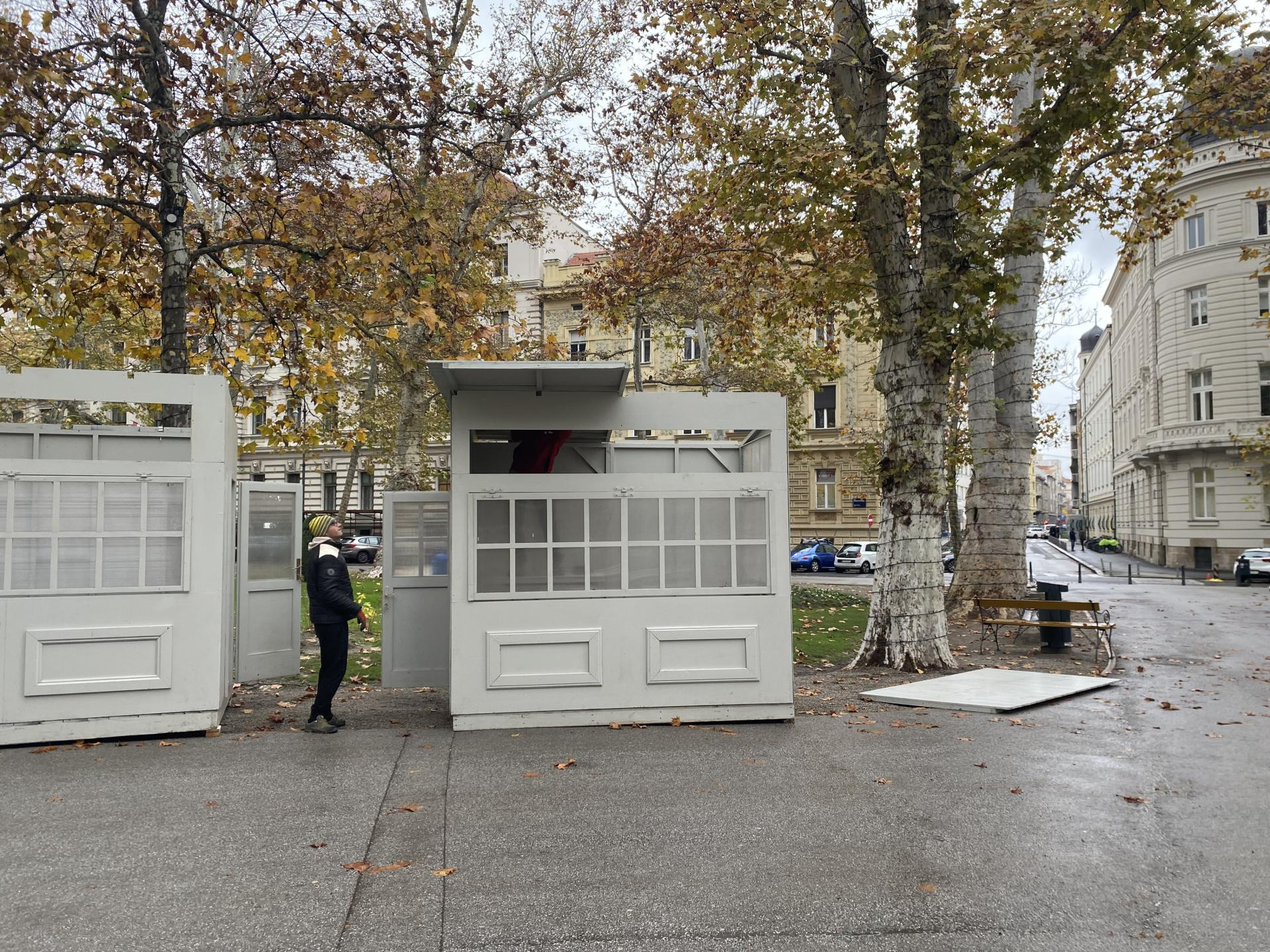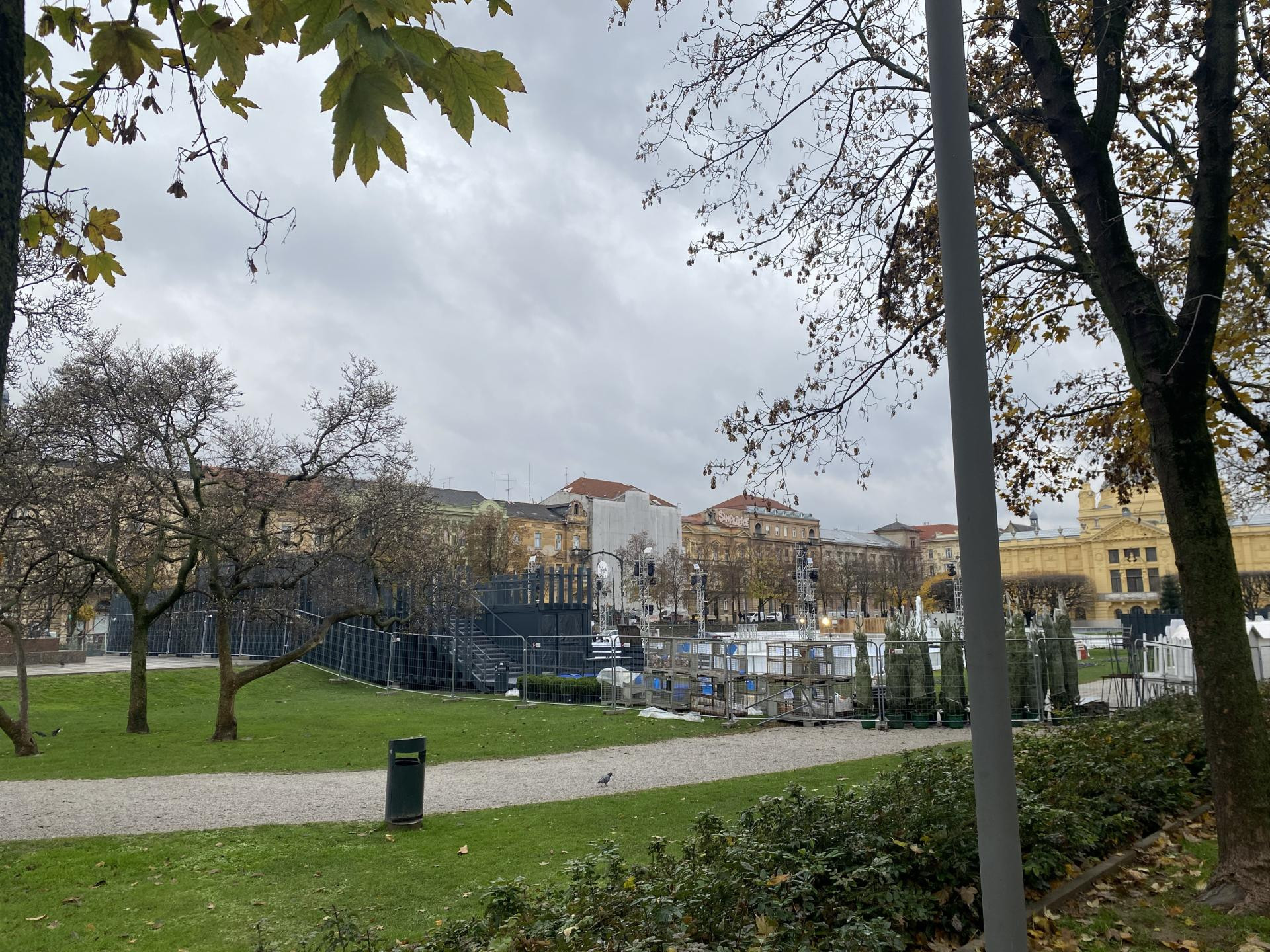 Sljedeći je park Zrinjevac. Cijeli je park prekriven drvenim komadima koji će uskoro činiti adventske kućice, a kada stižemo su na terenu i radnici.
