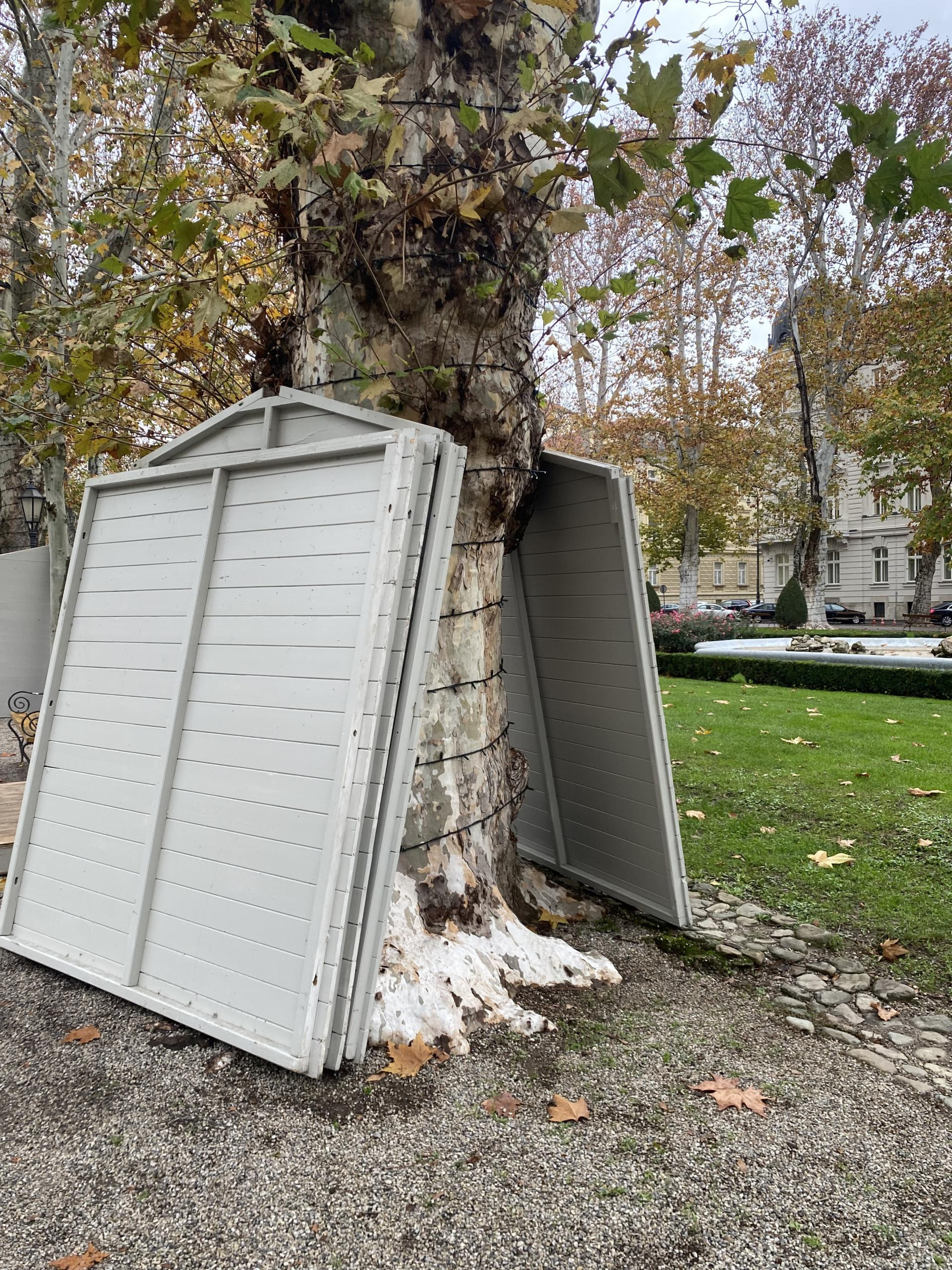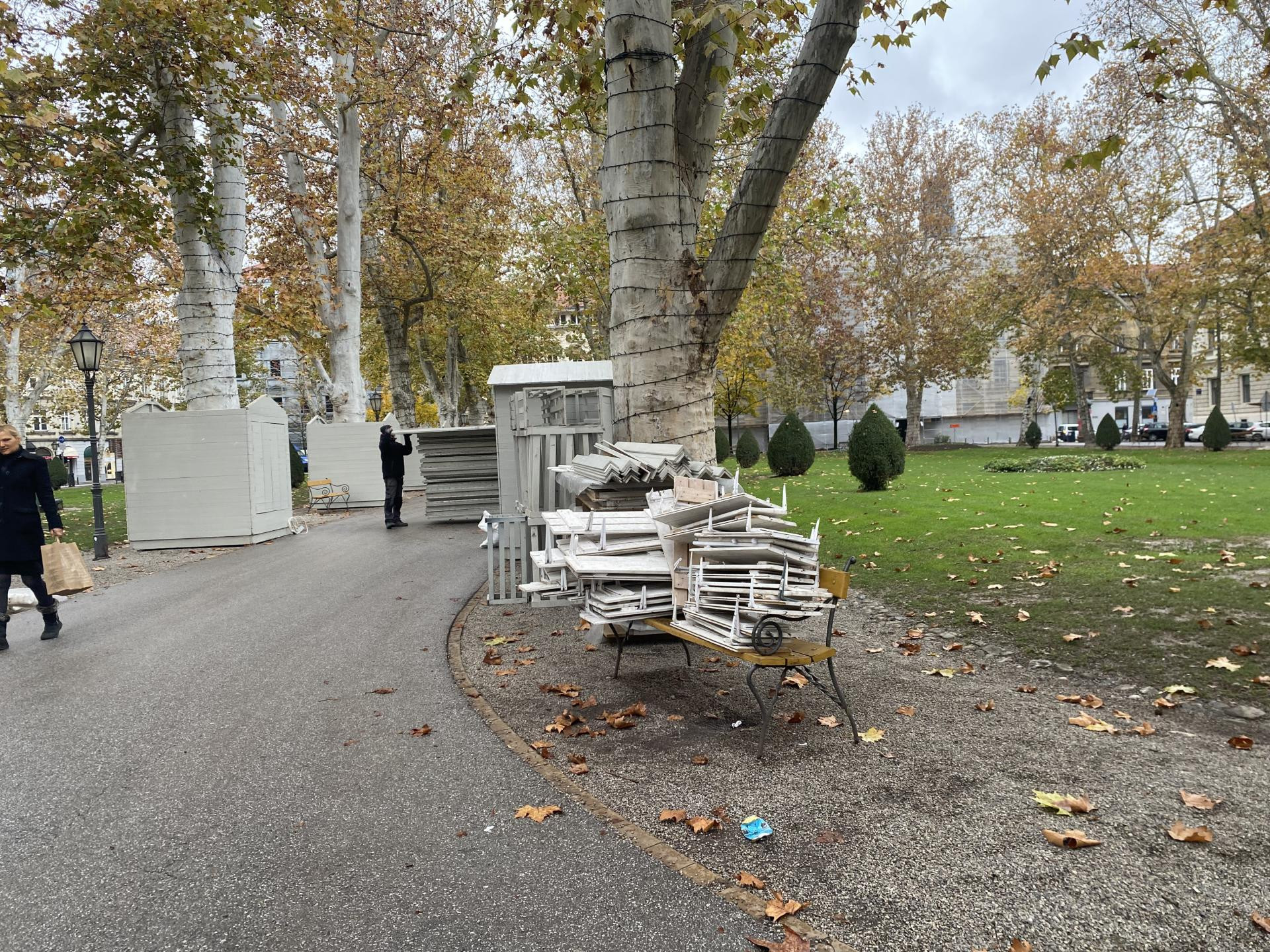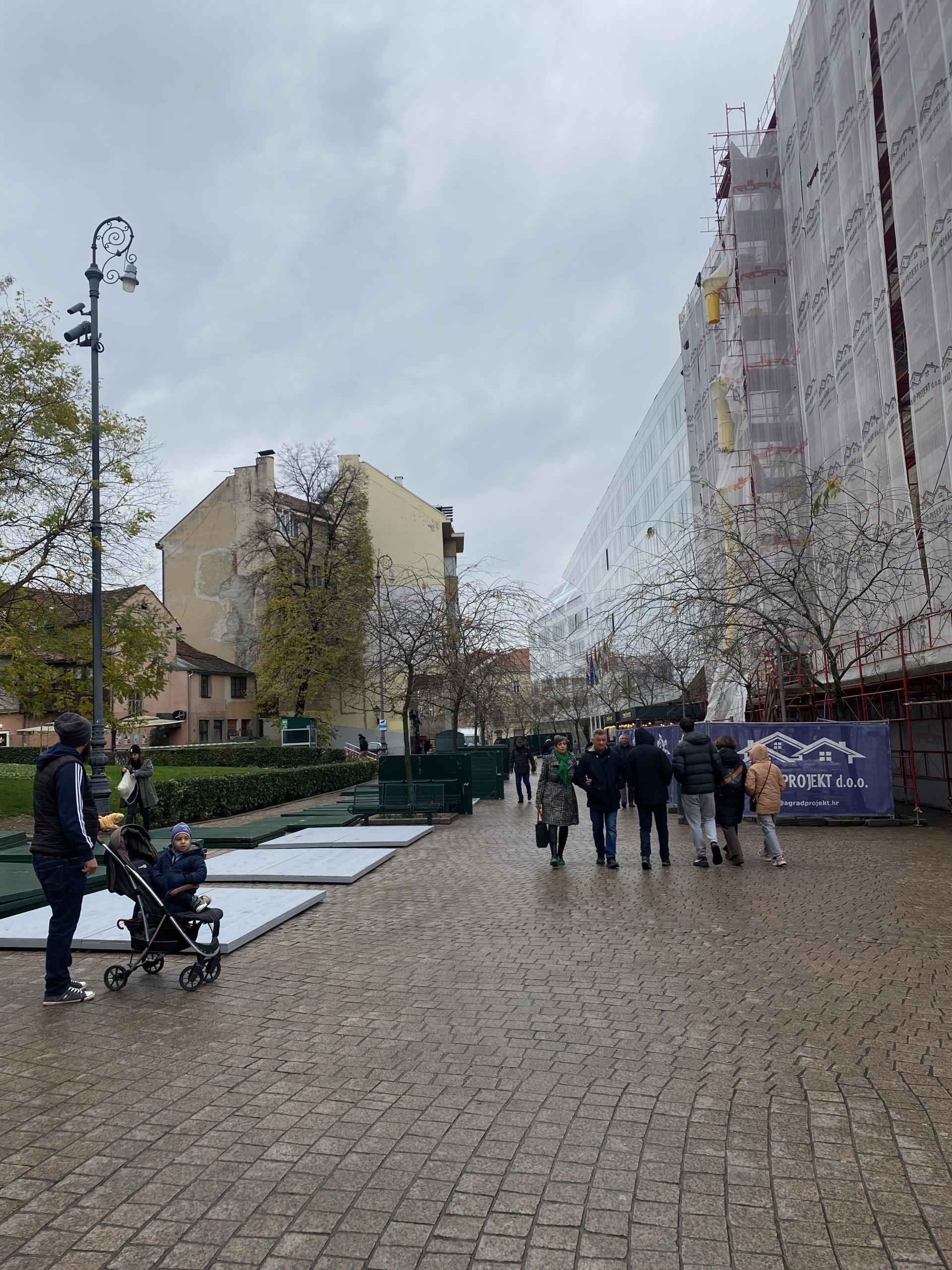 Sljedeći je park Zrinjevac. Cijeli je park prekriven drvenim komadima koji će uskoro činiti adventske kućice, a kada stižemo su na terenu i radnici.
