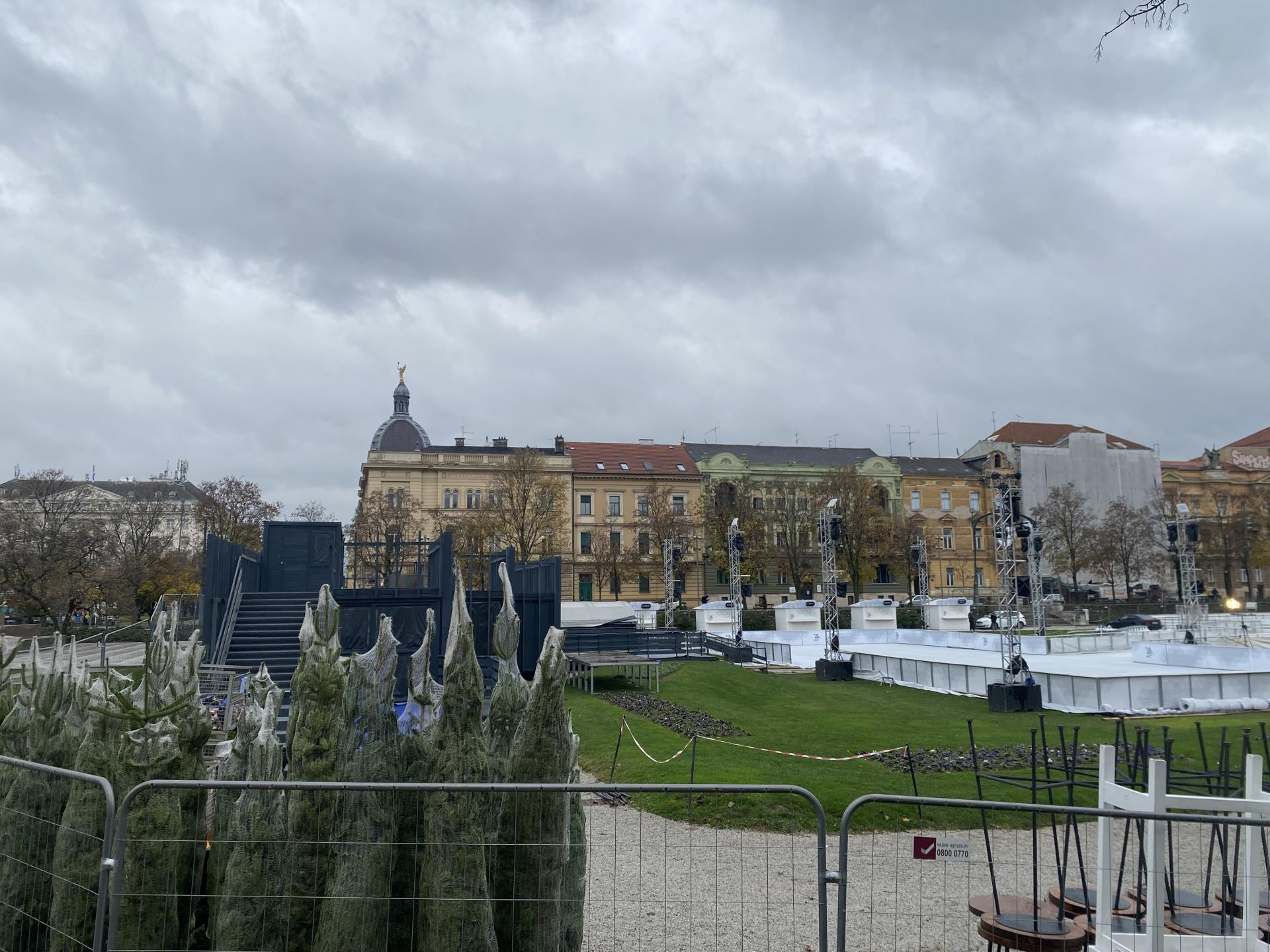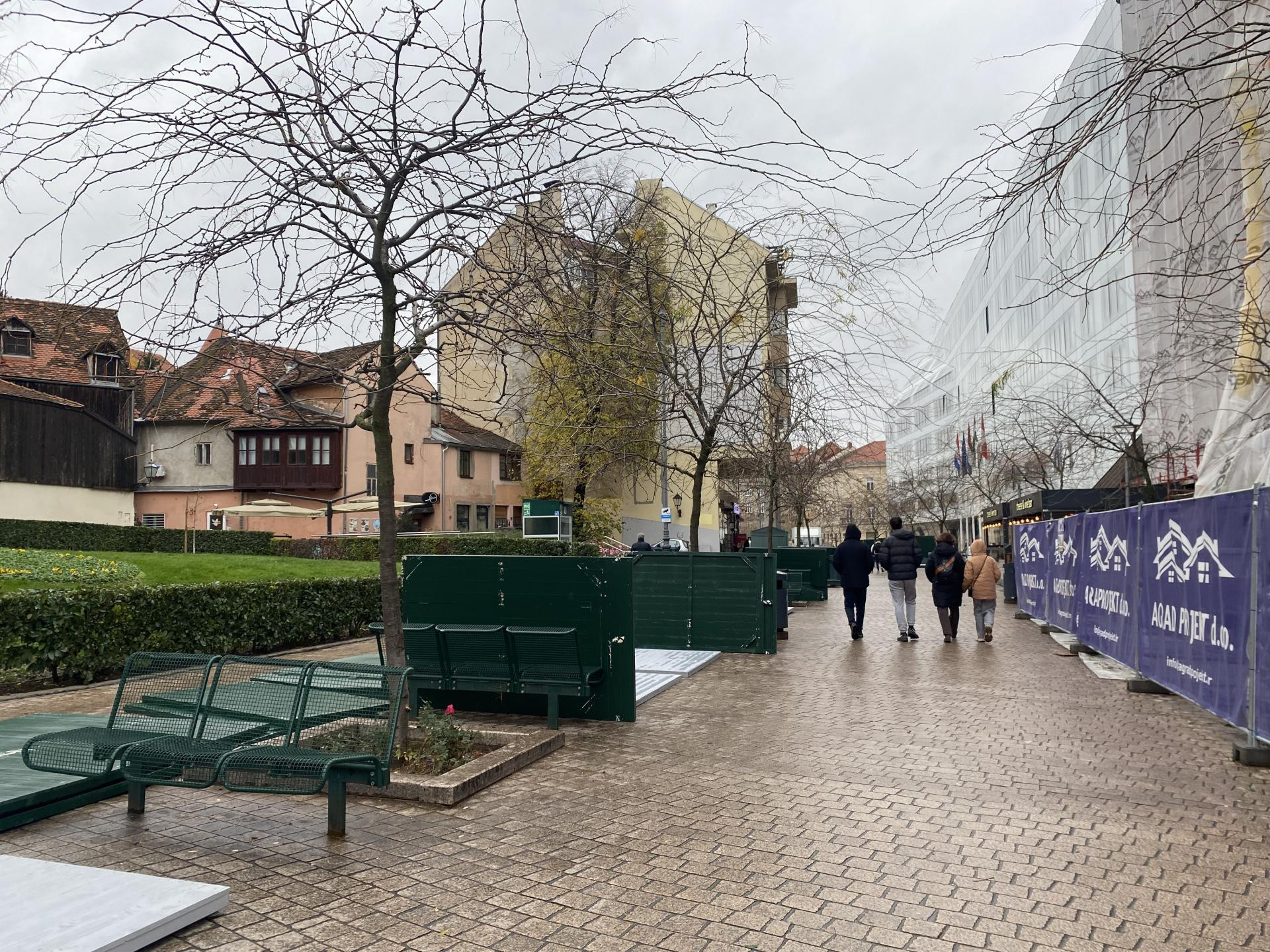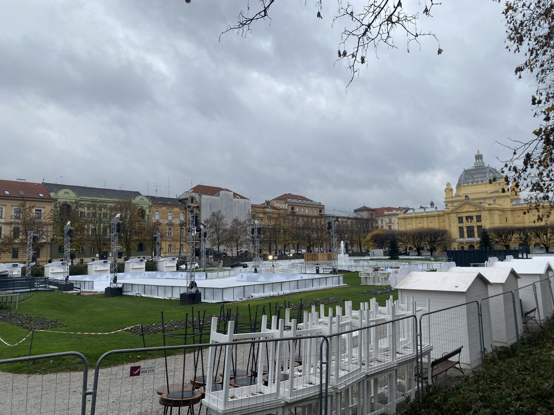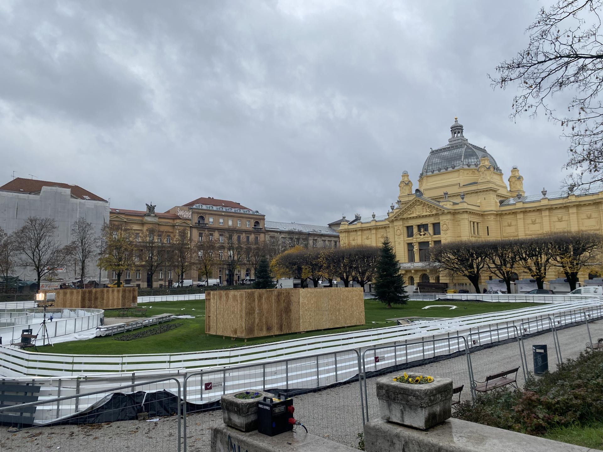 Prvo smo obišli Trg kralja Tomislava i njegovo poznato klizalište. Kostur klizališta je već namješten, a sada se dorađuju detalji. Kućice, koje se nalaze na sjevernom dijelu trga, uz Umjetnički paviljon Zagreba, a koje gledaju na klizalište su već postavljene, čekaju na useljenje ugostitelja.