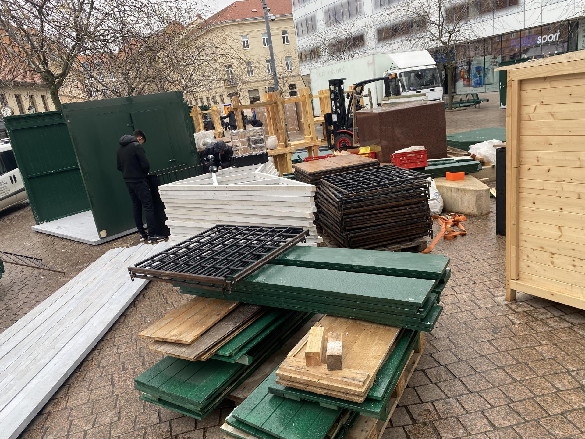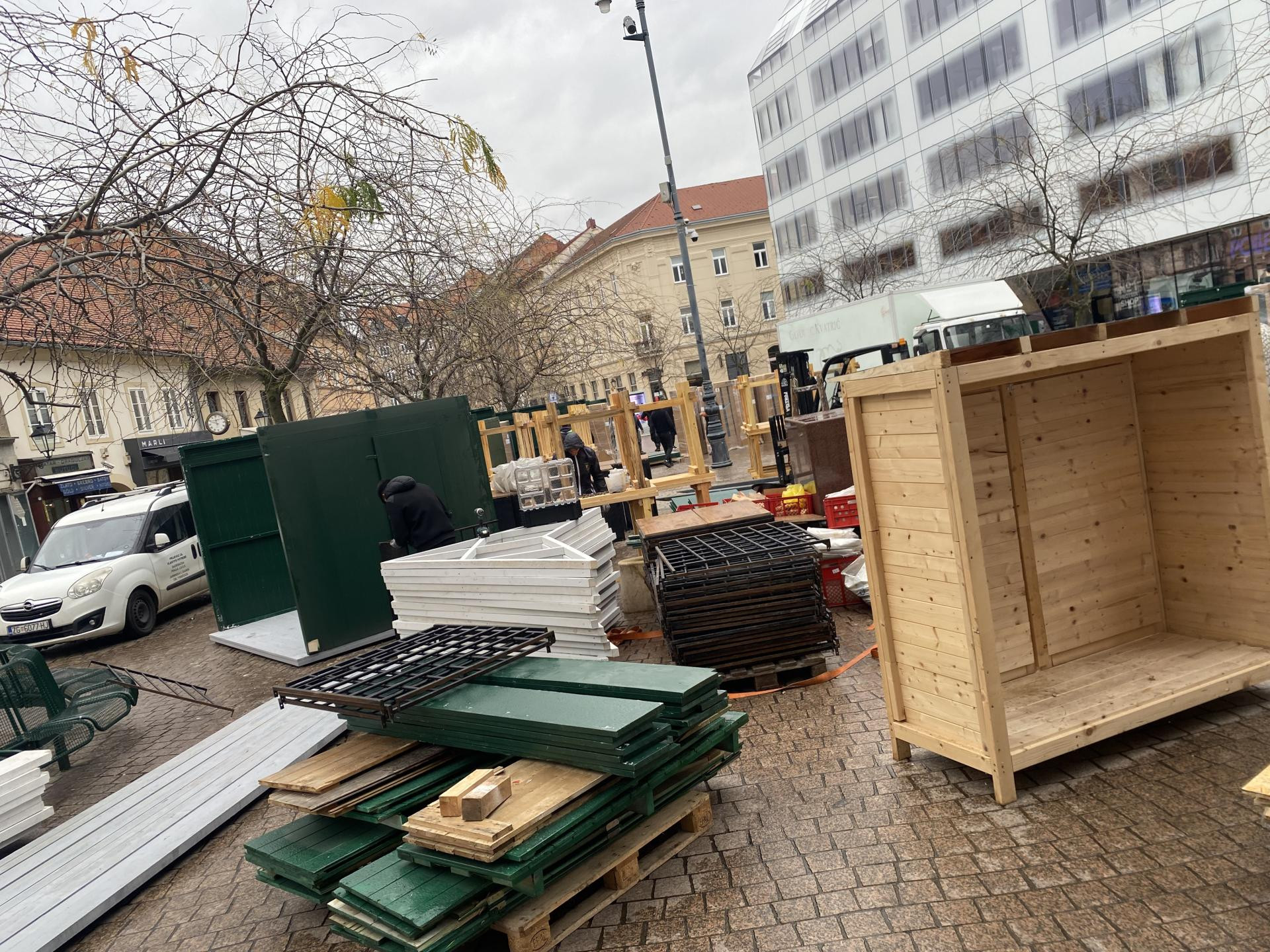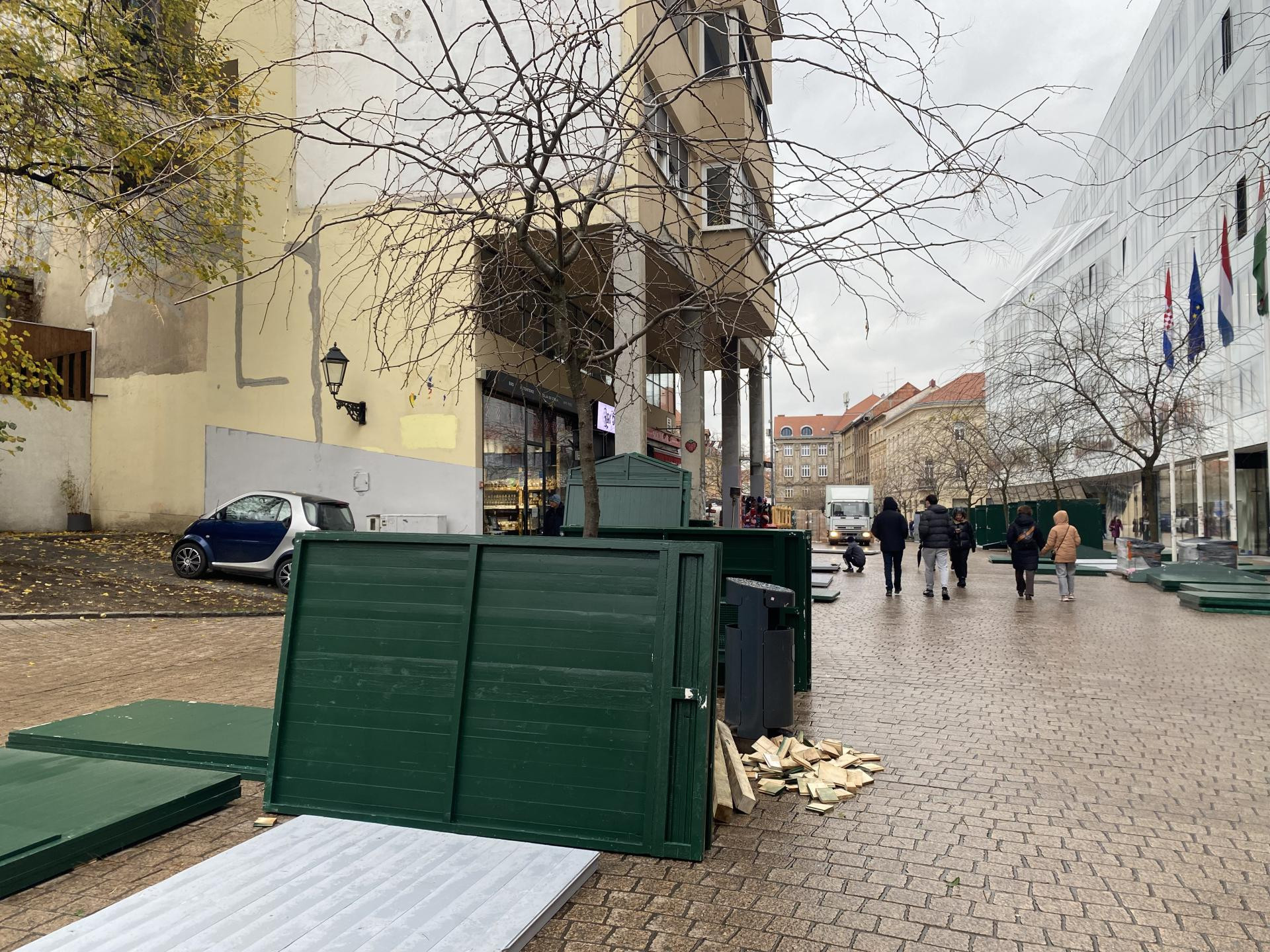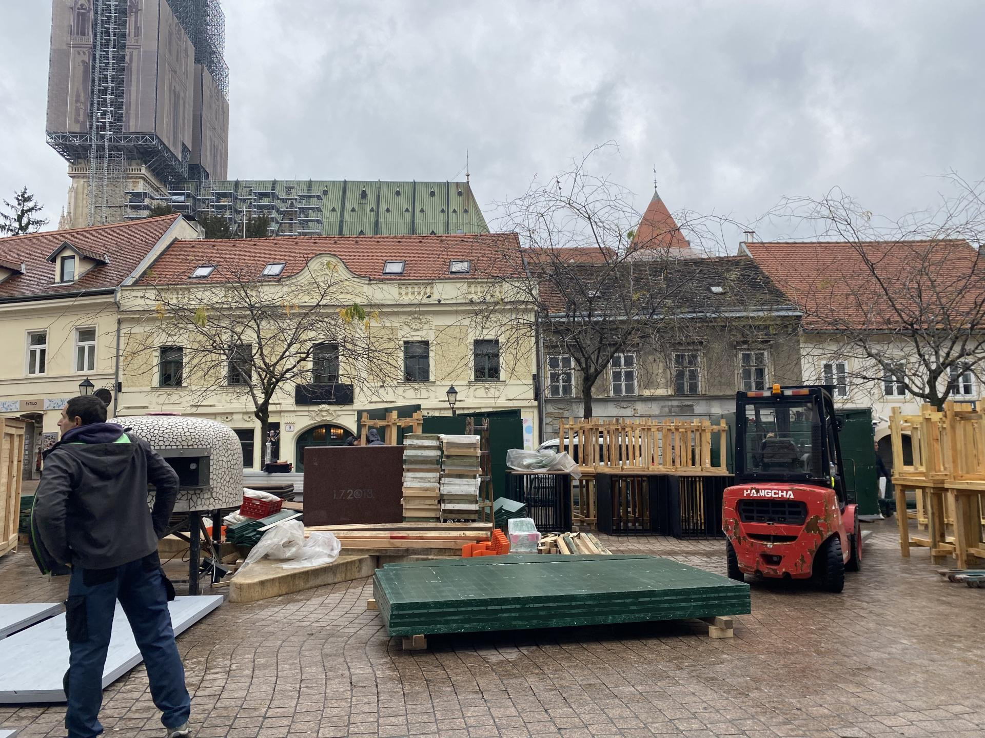 Minutu hoda dalje dolazimo i do Europskog trga. Tamo su pripreme nešto sporije jer su do jučer bili domaćini tržnice, a danas su se već bacili u ozbiljne pripreme. Svejedno, i tamo relativno brzo niče silueta onoga što će za nekoliko dana biti zagrebački Advent.