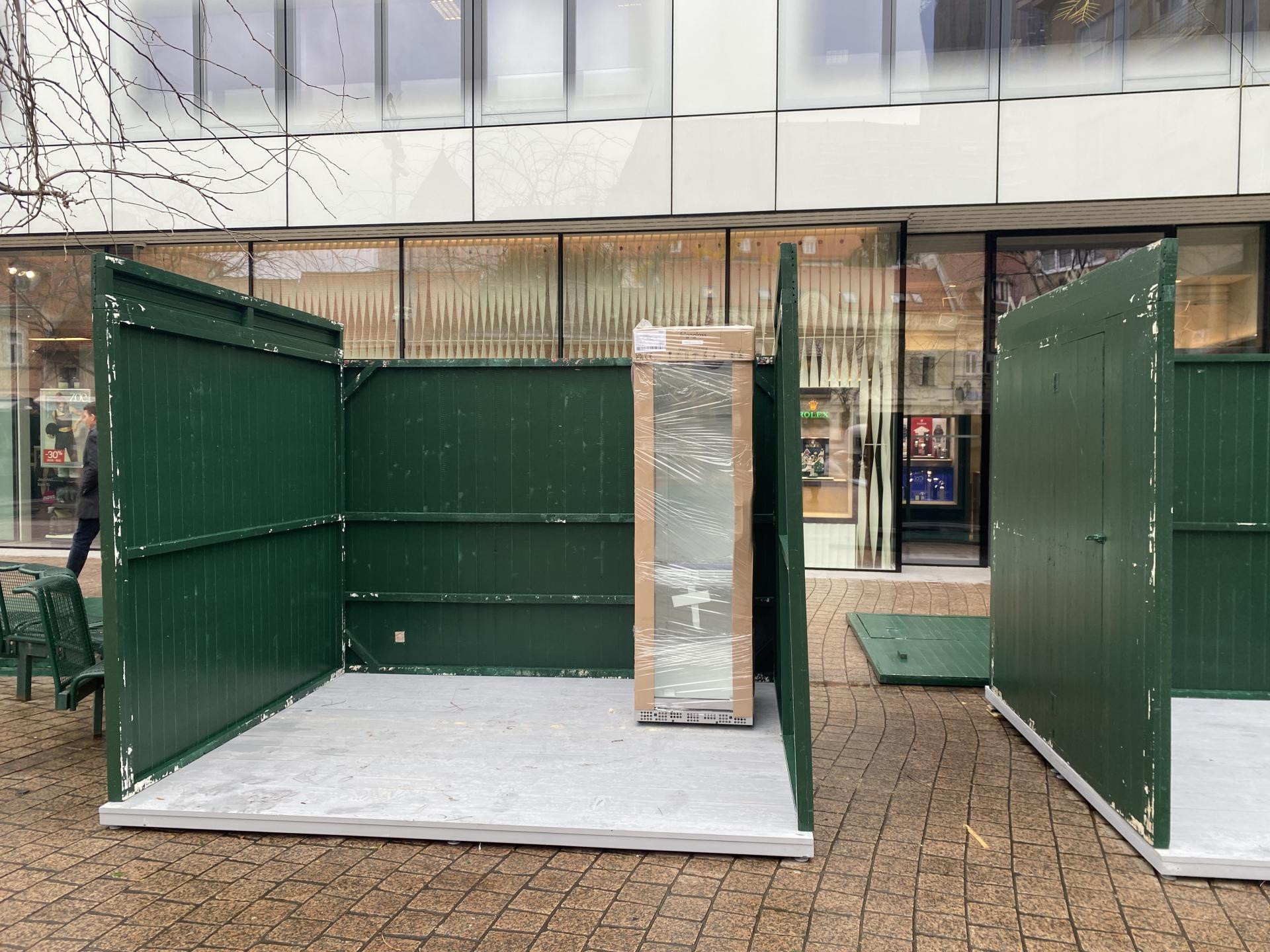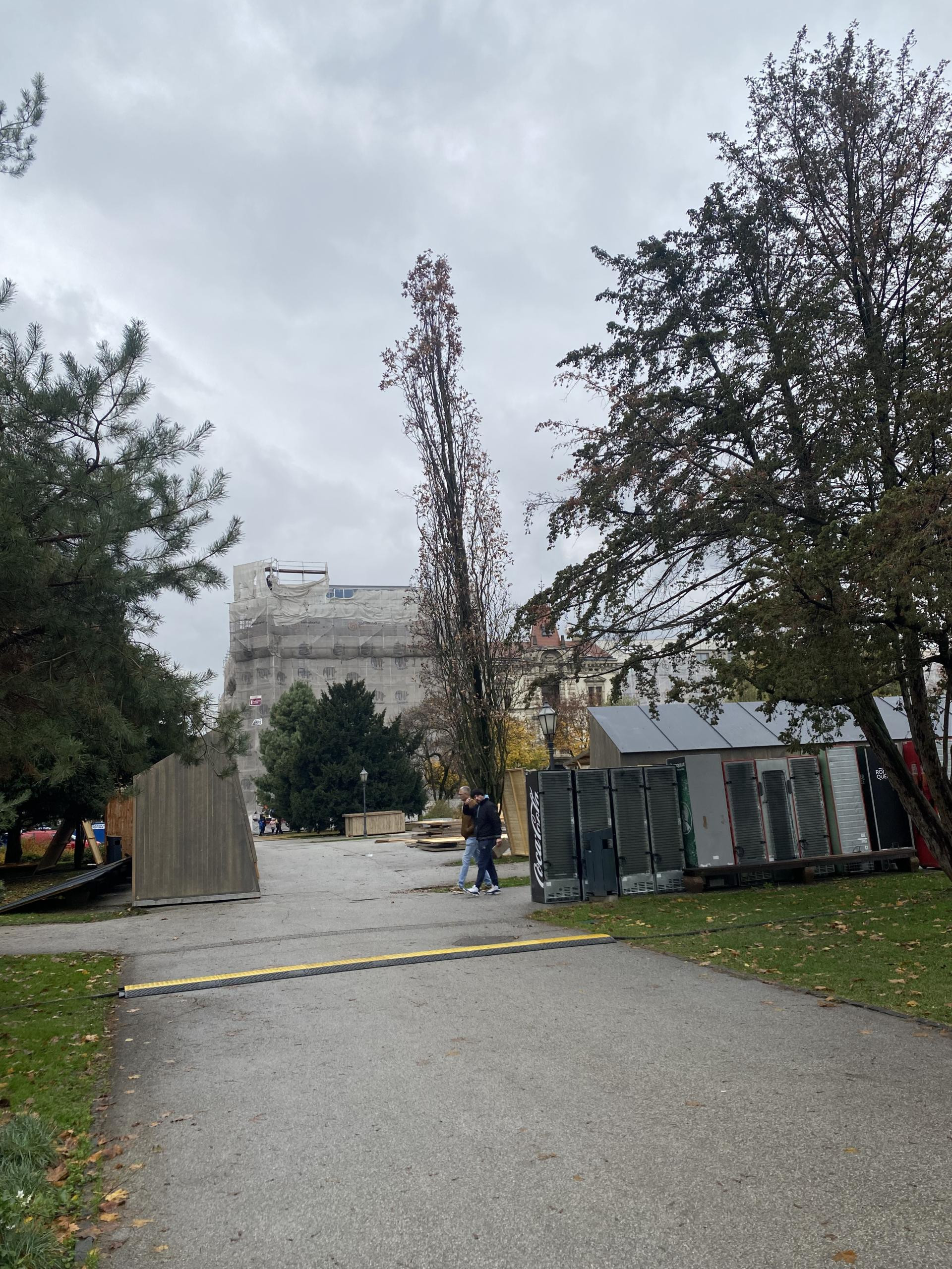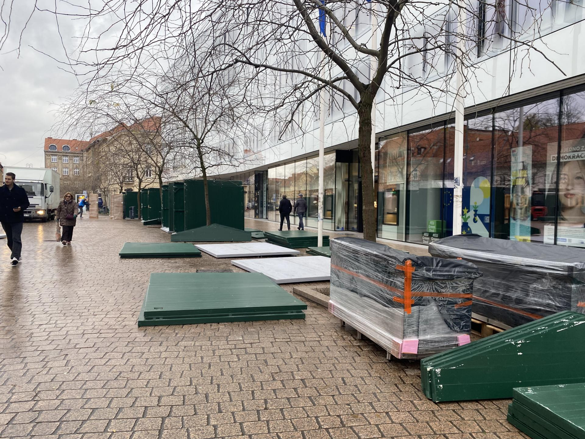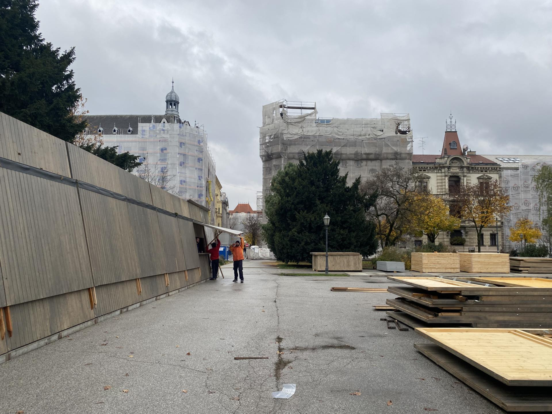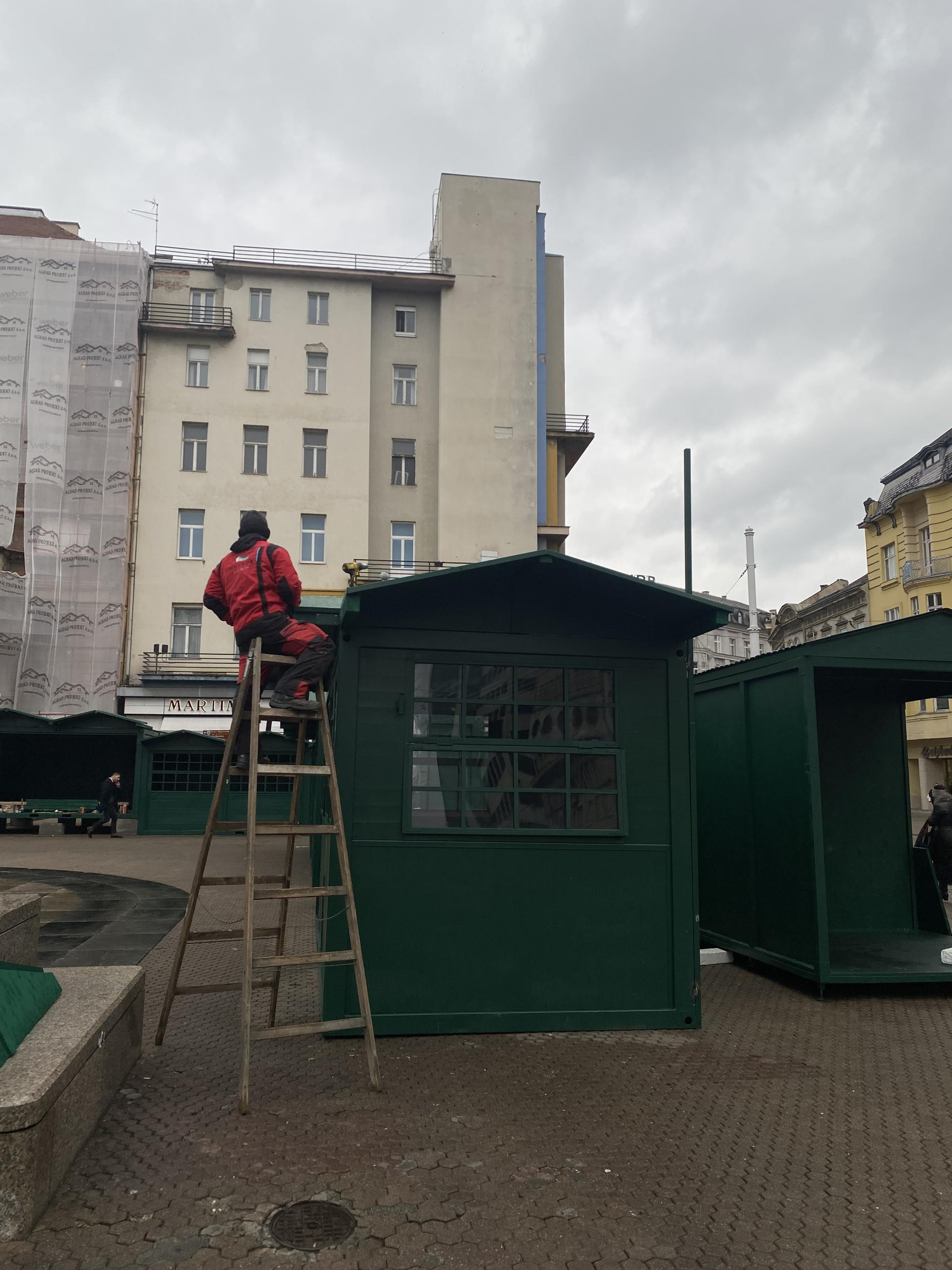 Minutu hoda dalje dolazimo i do Europskog trga. Tamo su pripreme nešto sporije jer su do jučer bili domaćini tržnice, a danas su se već bacili u ozbiljne pripreme. Svejedno, i tamo relativno brzo niče silueta onoga što će za nekoliko dana biti zagrebački Advent.