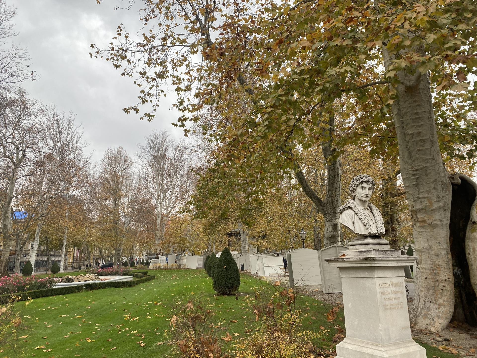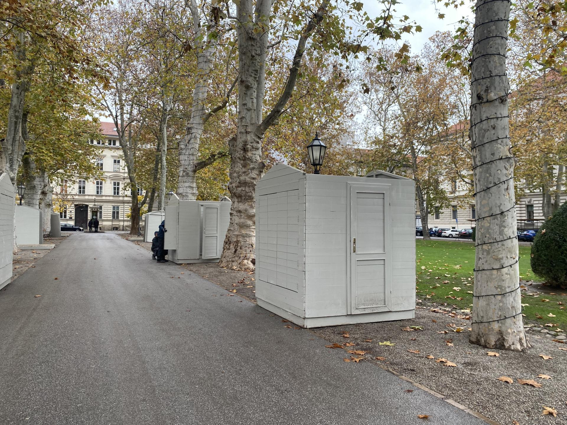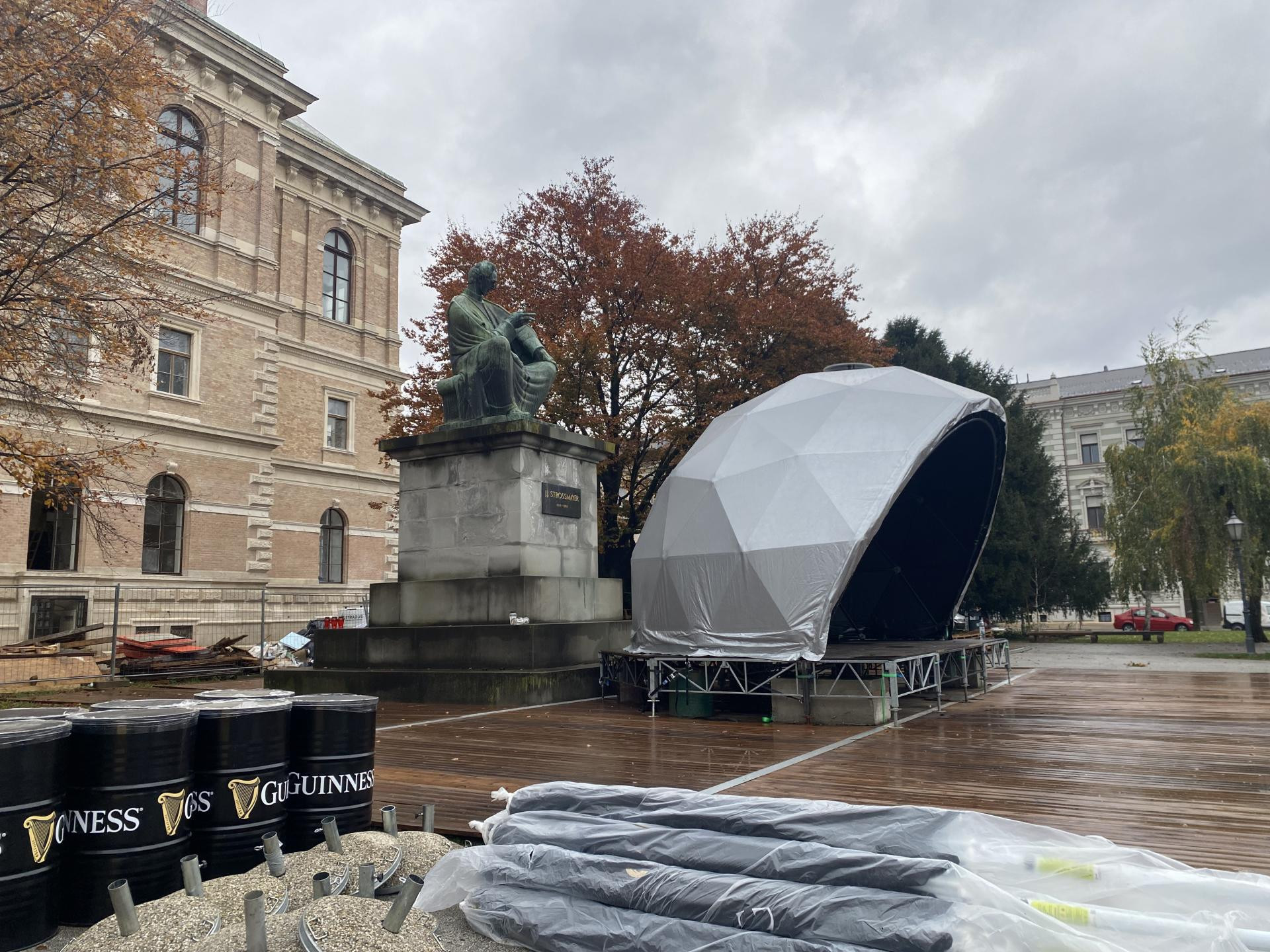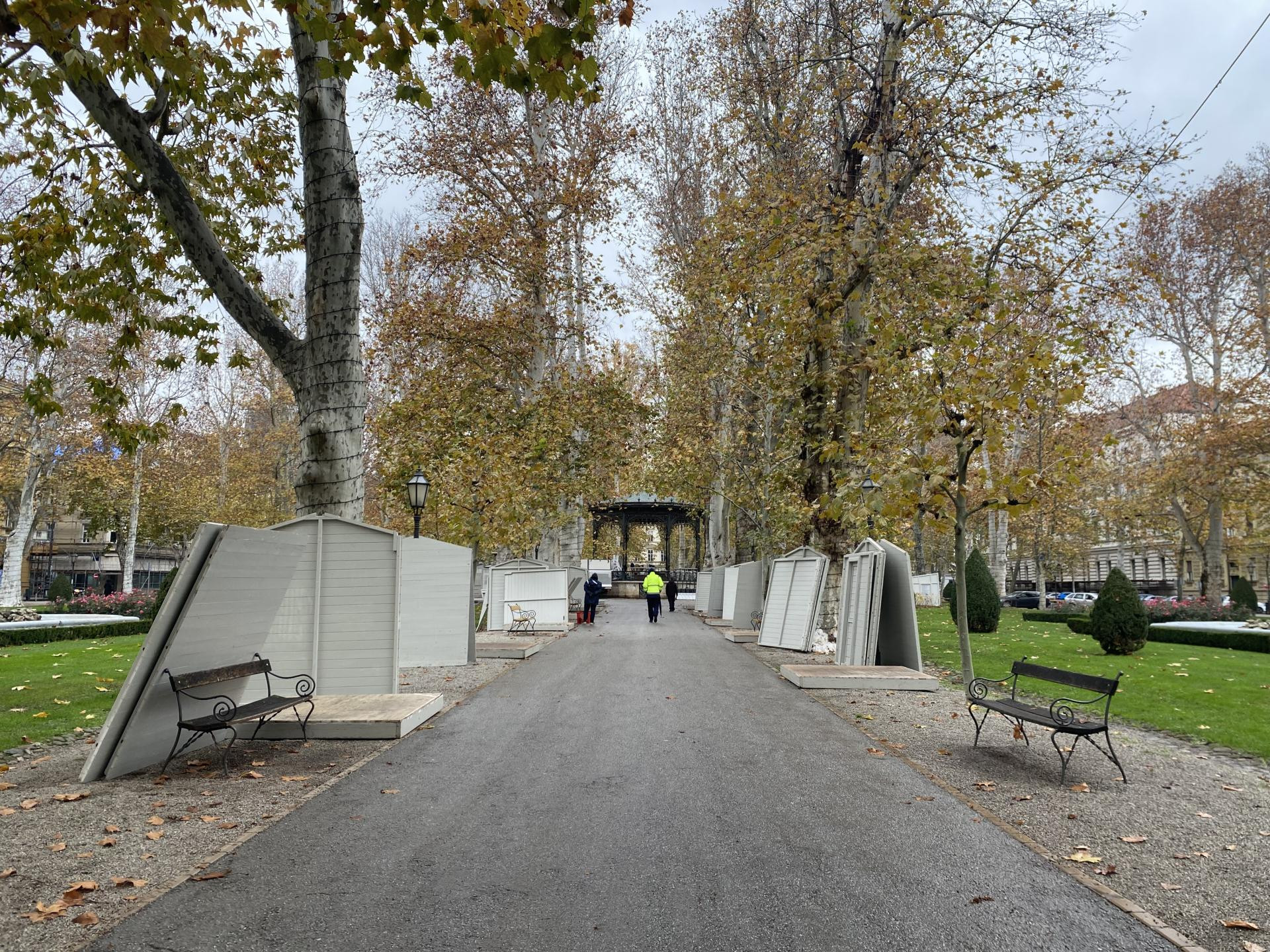 U nastavku smo obišli i zavučeni park Josipa Jurja Strossmayera. Kao i na Tomislavcu, i u parku su kućice već poprimile svoj oblik, a Strossmayerov kip već djelomično prekriva mala pozornica.