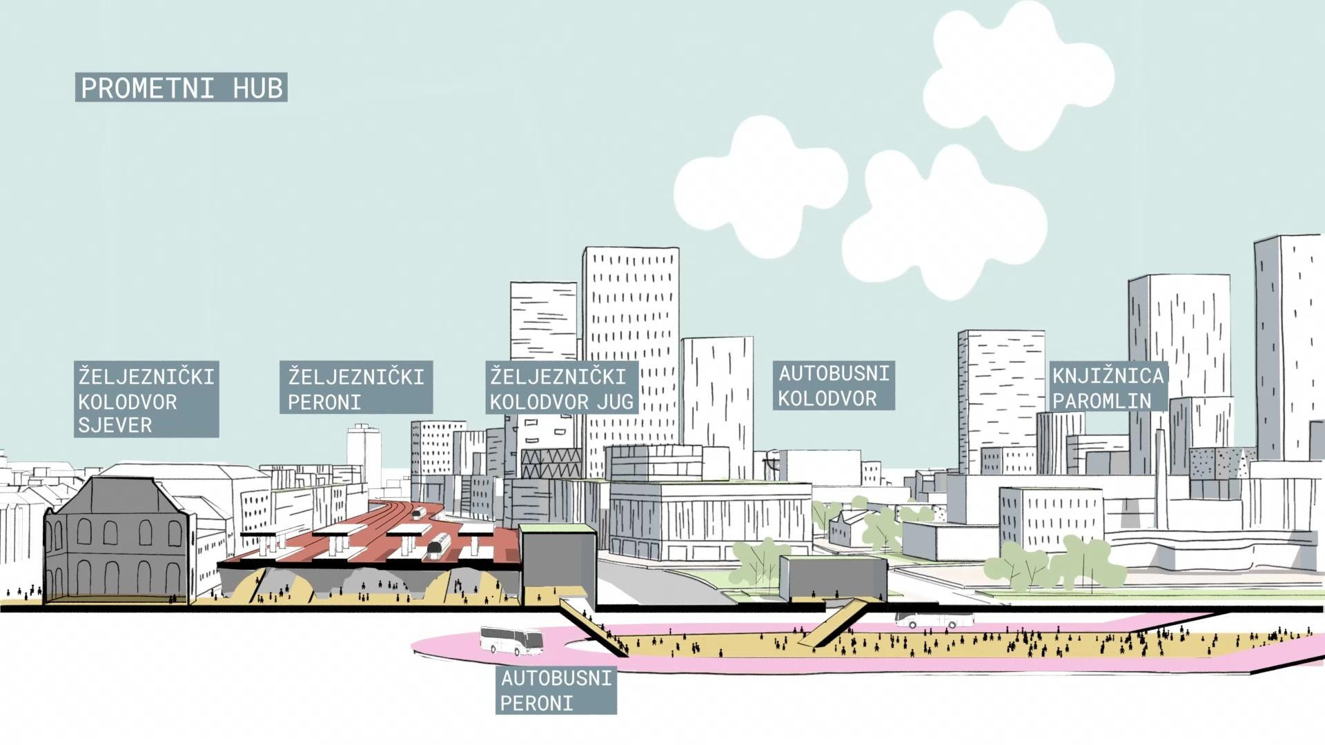 Novi autobusni kolodvor u njihovoj je studiji na centralnoj osi zamišljen kao suvremeni intermodalni terminal koji u jednoj točki spaja gradski, prigradski i međunarodni promet. Smješten uz Paromlin i na rubu transformiranog Gredelja, postaje glavni ulaz u Zagreb i ostvaruje neposrednu vezu sa željezničkim kolodvorom i podignutim peronima. Pruga je u toj studiji u Zagrebu već podignuta u zrak.
