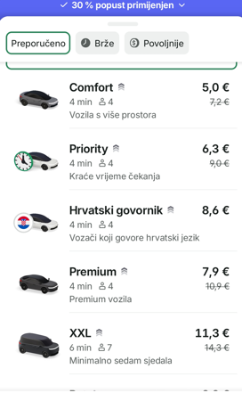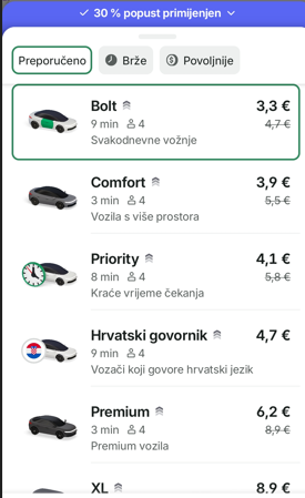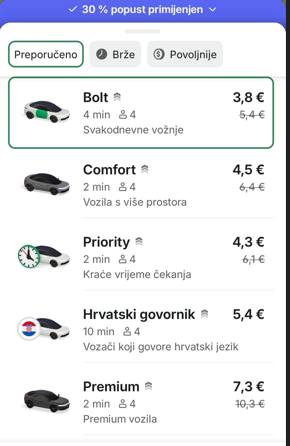 Svaka od kategorija ima i svoju cijenu, pa bi vas, primjerice, vožnja u Premium vozilu trebala stajati više nego vožnja u klasičnom Bolt vozilu, dok bi kategorija hrvatskog govornika trebala biti izjednačena s običnim Boltom. Ipak, situacija na terenu nešto je drugačija: vožnje s hrvatskim govornicima gotovo su uvijek skuplje od klasične Bolt opcije.