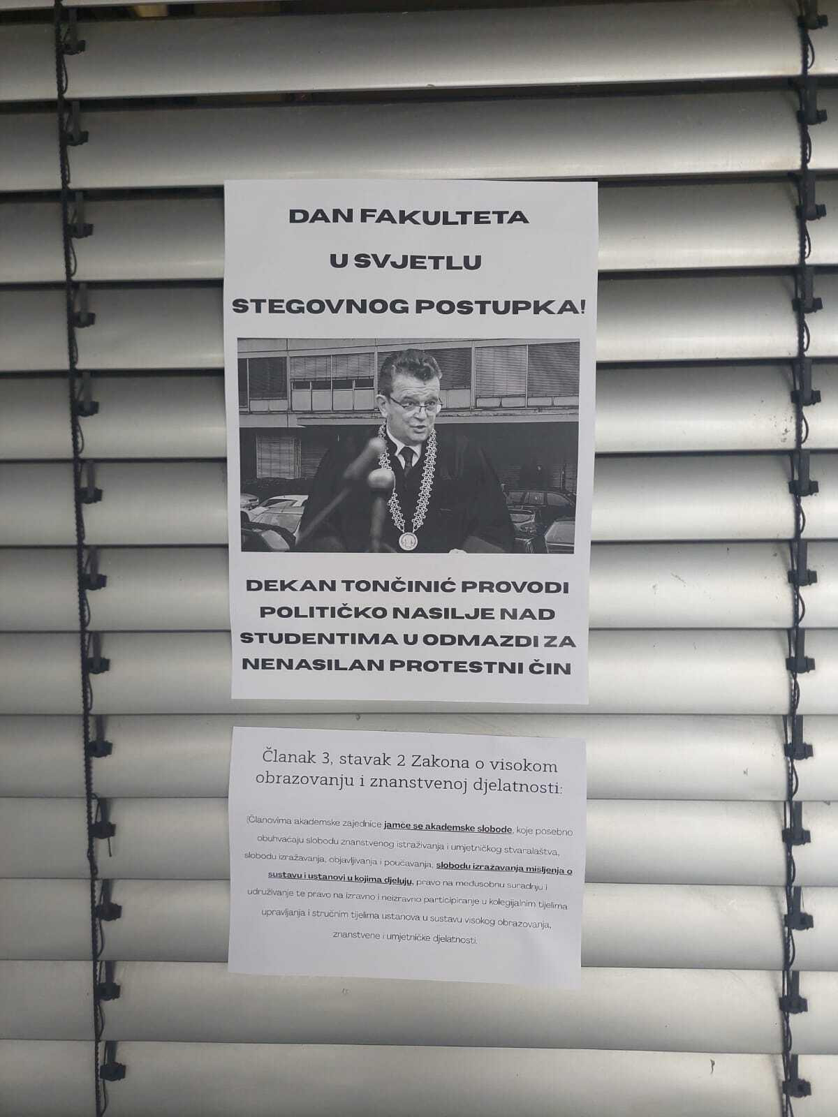 Ubrzo nakon što se saznalo za suspenzije, diljem zgrade Fakulteta, kako nam javljaju čitatelji, pojavili su se plakati na kojima se osuđuje dekanov potez prema studentima i na njima piše da "dekan Tončinić provodi političko nasilje nad studentima u odmazdi za nenasilan protestni čin", a kao dodatak na plakatu stoji podsjetnik na članak 3., stavak 2. Zakona o visokom obrazovanju i znanstvenoj djelatnosti, prema kojem se članovima akademske zajednice jamči sloboda izražavanja mišljenja o sustavu i ustanovi u kojima djeluju.