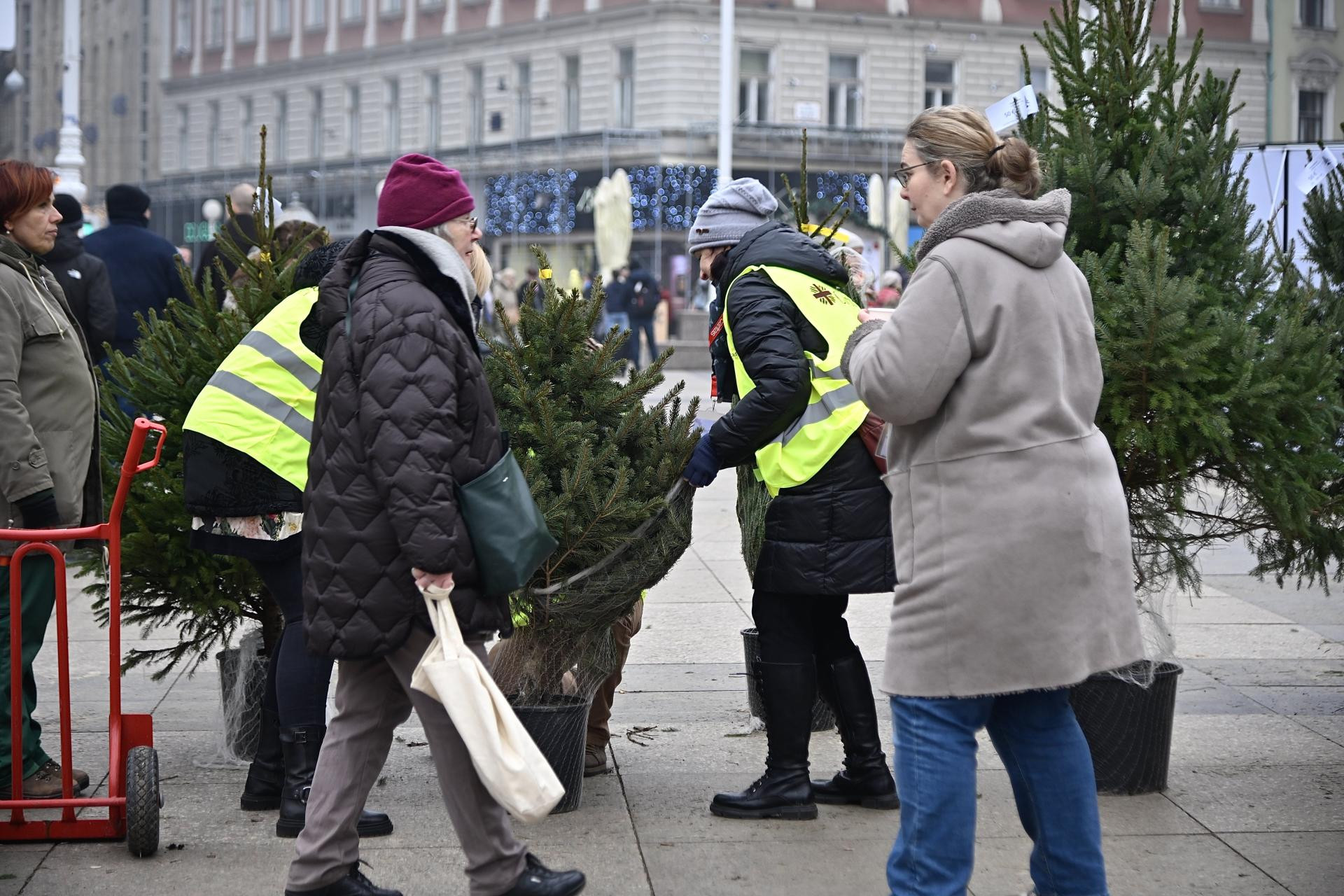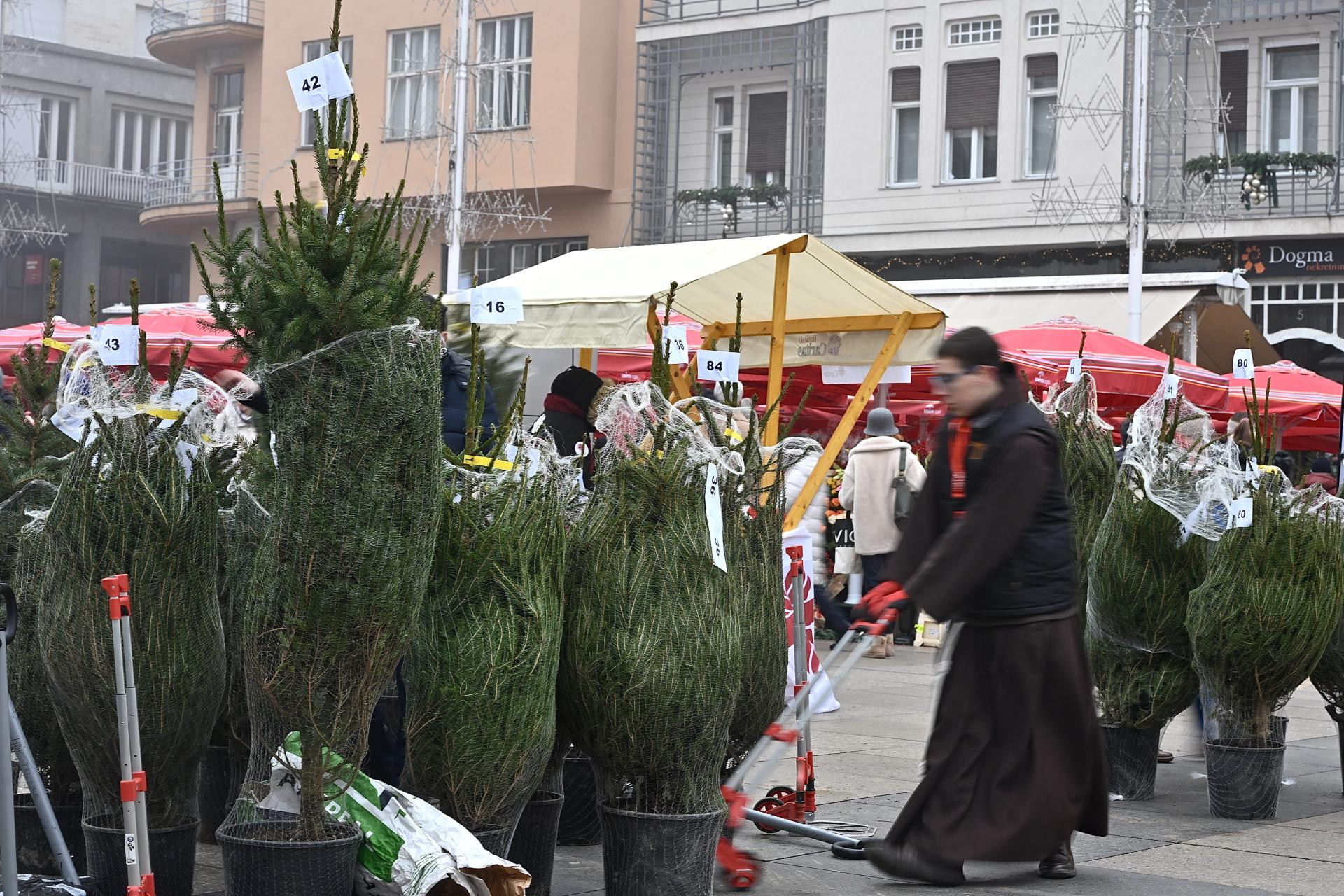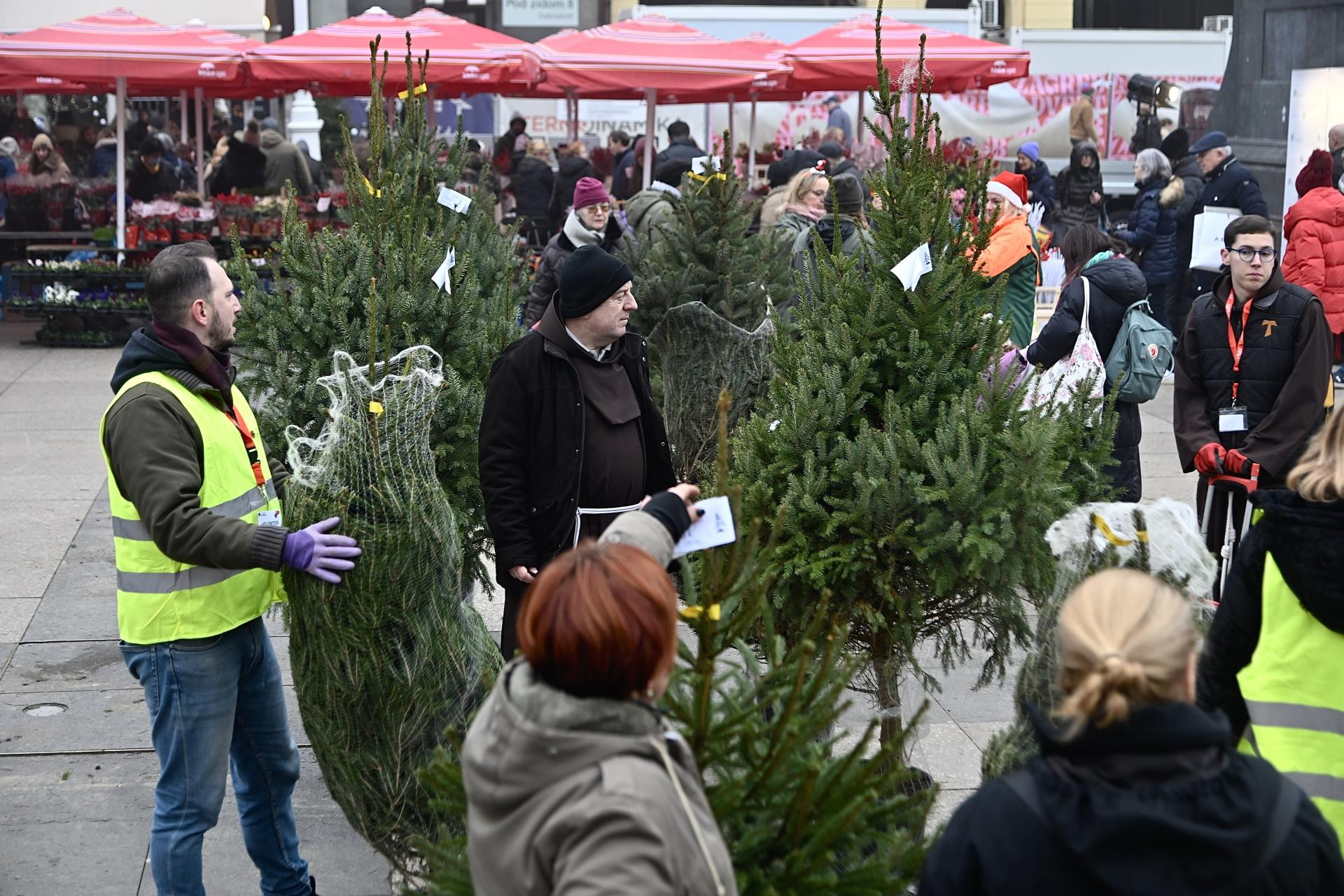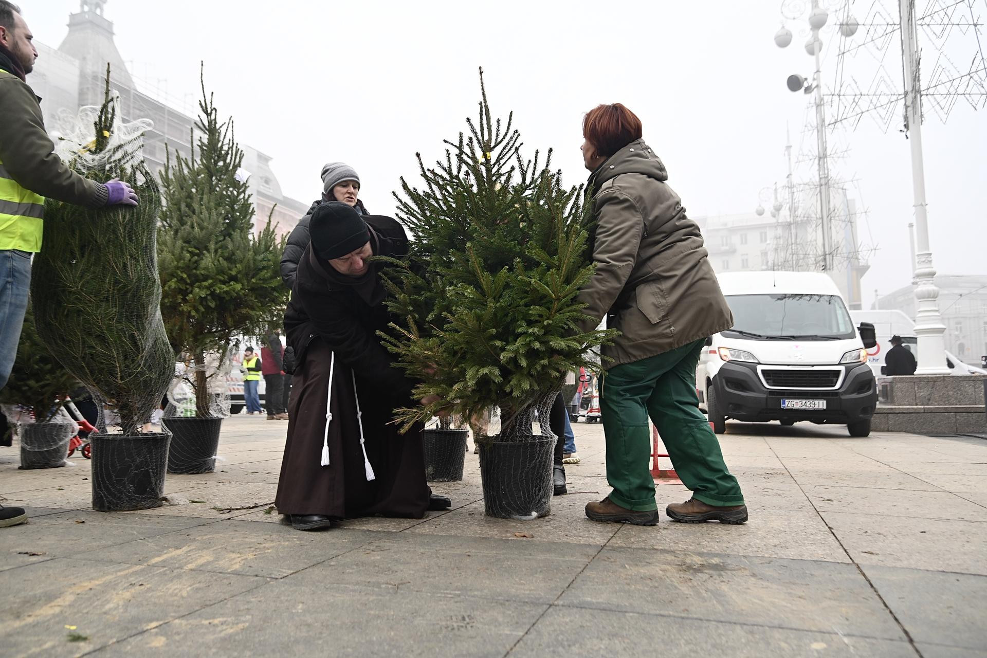 Božićna rasprodaja drvca na glavnom zagrebačkom trgu, kupcima će fratri i studenti pomagati prenositi ih