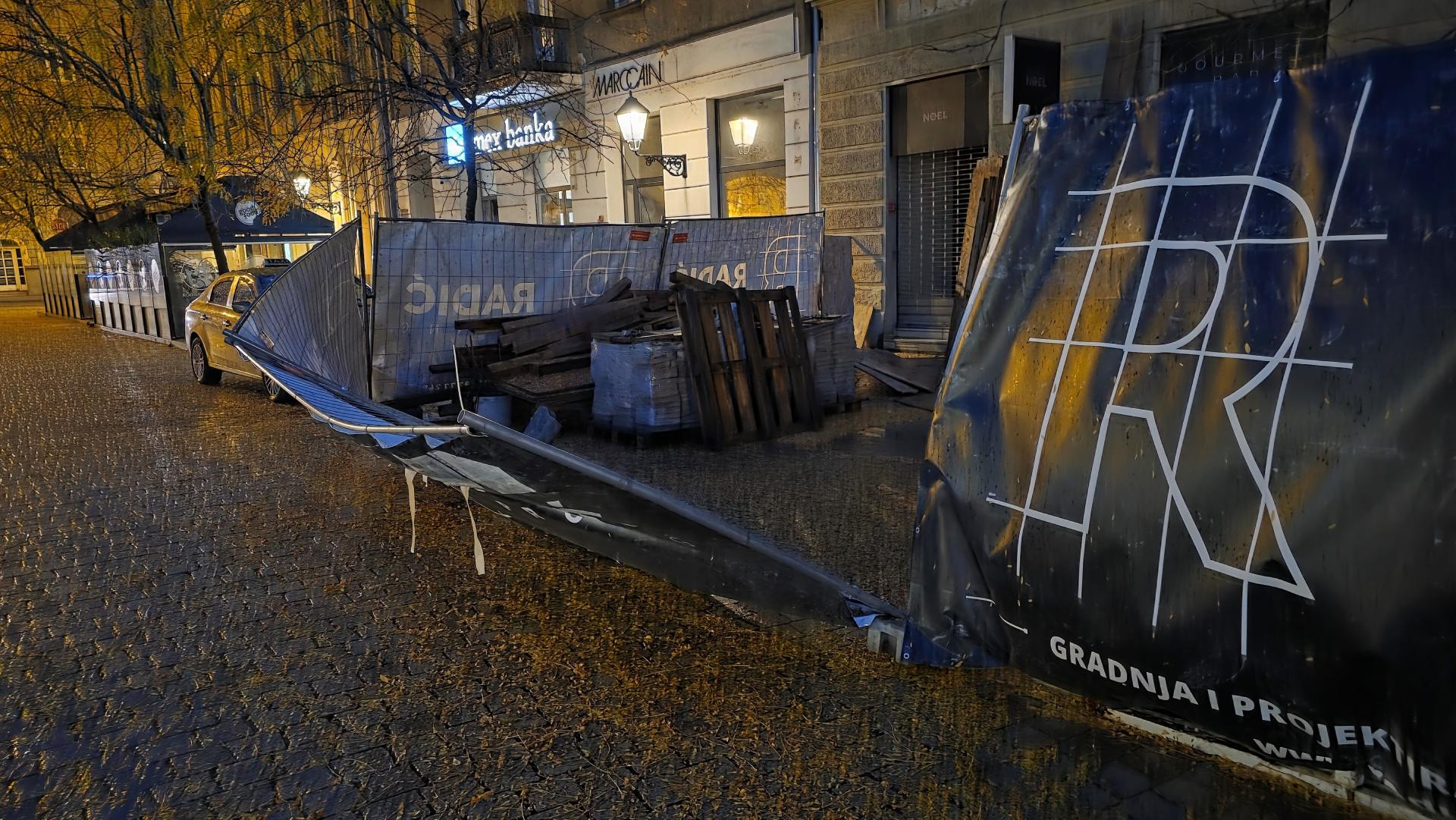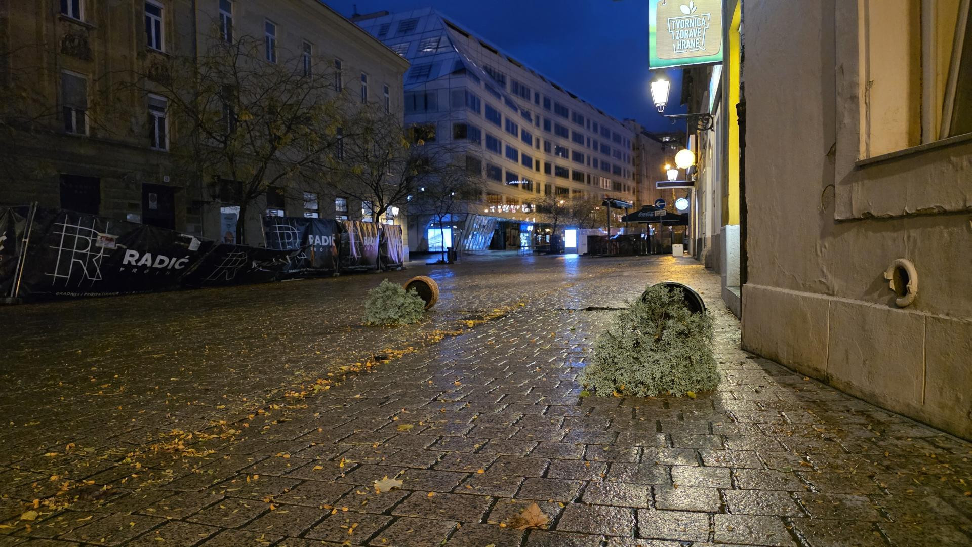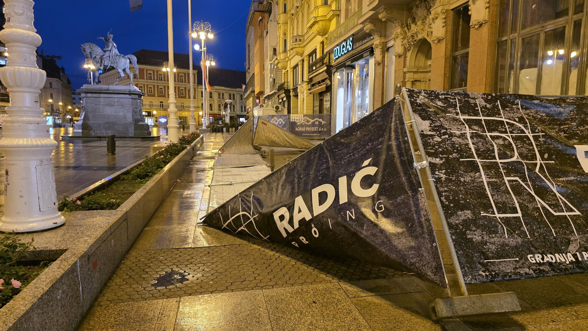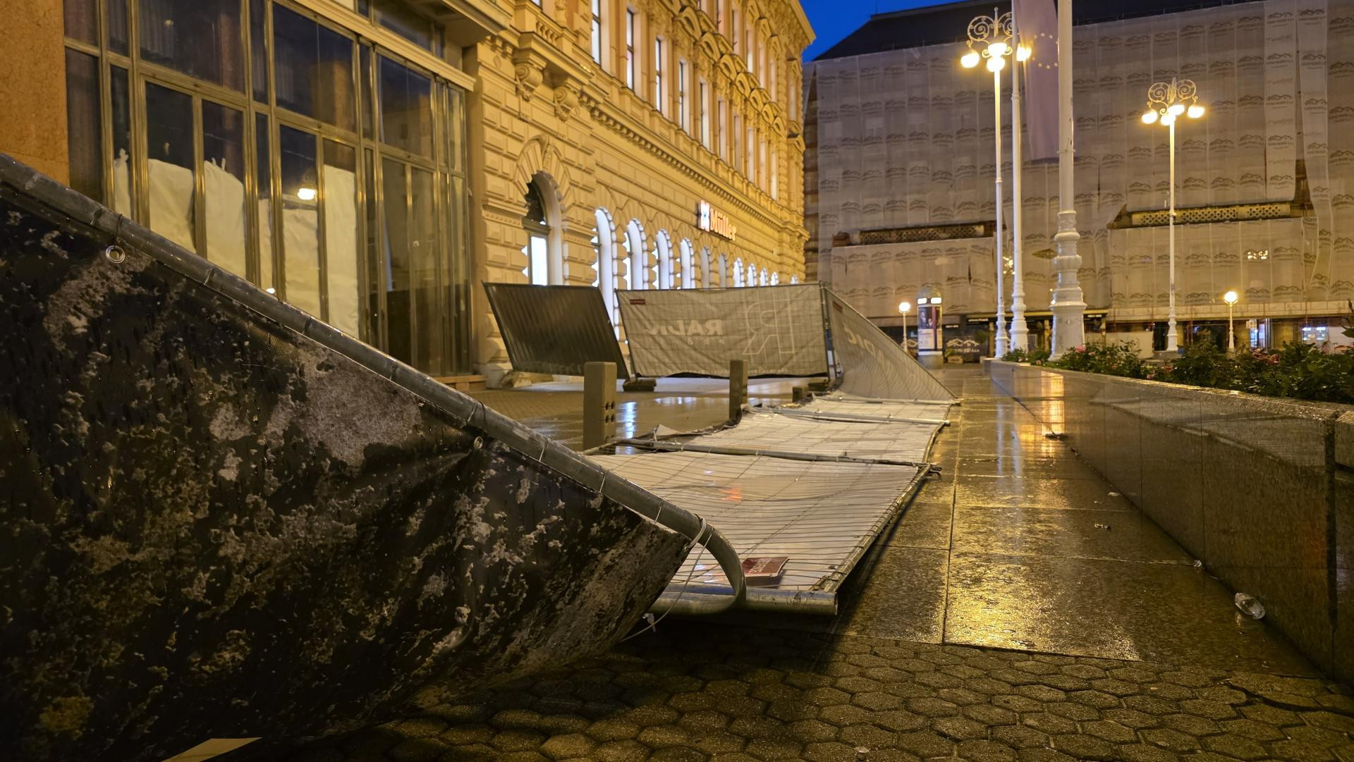 Fotografije zabilježene u ponedjeljak ujutro pokazuju prevrnute Bajs bicikle na postaji u pješačkoj zoni Vlaške između Dolca i Europskog trga. Prevrnuti su i dijelovi ograda koji su popustili pod udarima vjetra. Na Europskom trgu urušen je veći segment zaštitne konstrukcije uz južni rub gradilišta, koju je radnik izvođača radova neuspješno pokušavao uspraviti. U naletima vjetra ograda je oštećena do te mjere da više ne može samostalno stajati. Zanimljivo je i kako isti izvođač radova obnavlja zgradu Gradske kavane, ali i Harmice na Trgu bana Jelačića. Te ograde su također pretrpjele veliku štetu i vide se oštećenja kako na ogradi tako i na njihovim betonskim postoljima.