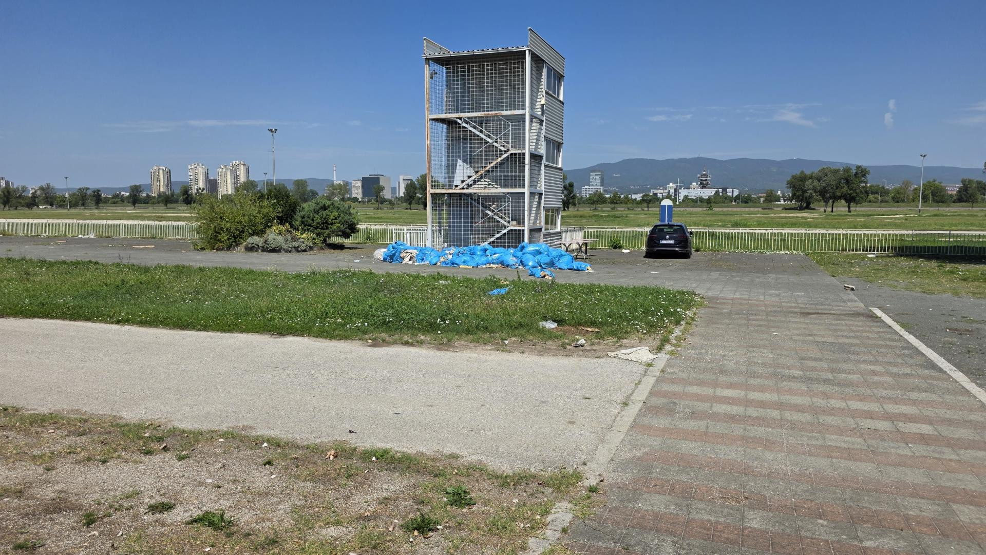 Na terenu su vidljive dvije veće hrpe otpada spremljene u svijetloplave vreće, po jedna ispod svakog od nadzornih tornjeva Hipodroma koji se koriste za vrijeme održavanja konjičkih manifestacija. Izuzev dviju hrpa smeća, na livadi je vidljiv i otpad koji je duž cijele njezine površine nanio vjetar.