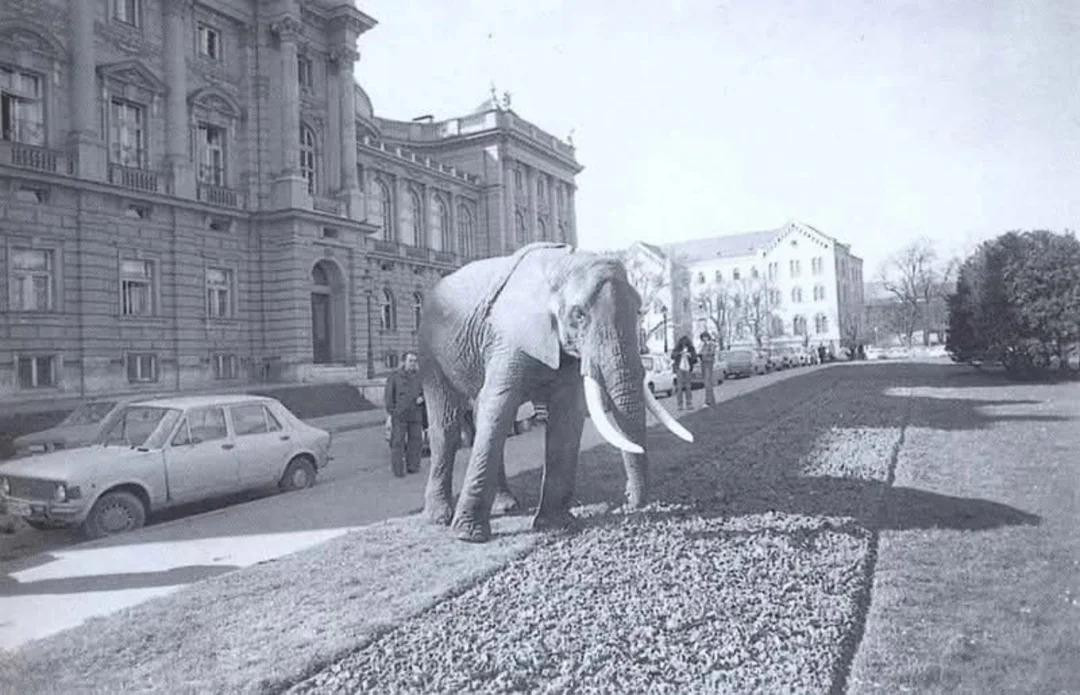 Slon se naime Zagrebom nije šetao do Veterinara. Fotografija s društvenih mreža prikazuje slona ispred Hrvatskog narodnog kazališta, no on nije iz Zoološkog vrta, već je prema informacijama kojima raspolažu i ZOO-a pripadao cirkusu koji je tada gostovao u gradu.