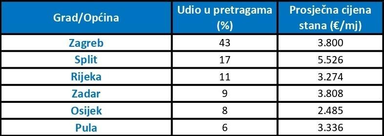 Istražili su i podatke o broju pretraživanja njihovog oglasnika. Prema udjelu u ukupnom broju pretraga, Zagreb i dalje prednjači s gotovo 43% svih pretraga stanova. Slijede Split s udjelom od 17%, Rijeka (11%) i Zadar (9%), dok je Osijek s 8% najtraženiji grad u kontinentalnom dijelu Hrvatske. Pula je zauzela šesto mjesto s 6% svih pretraga stanova u rujnu.